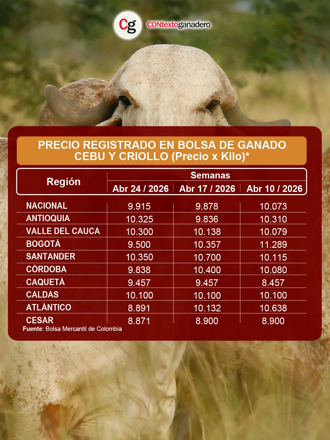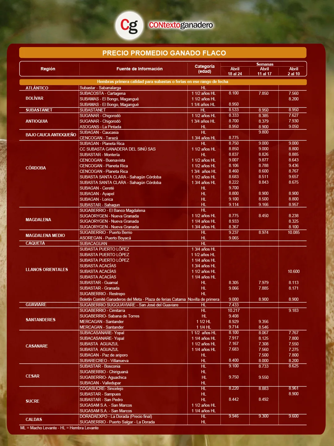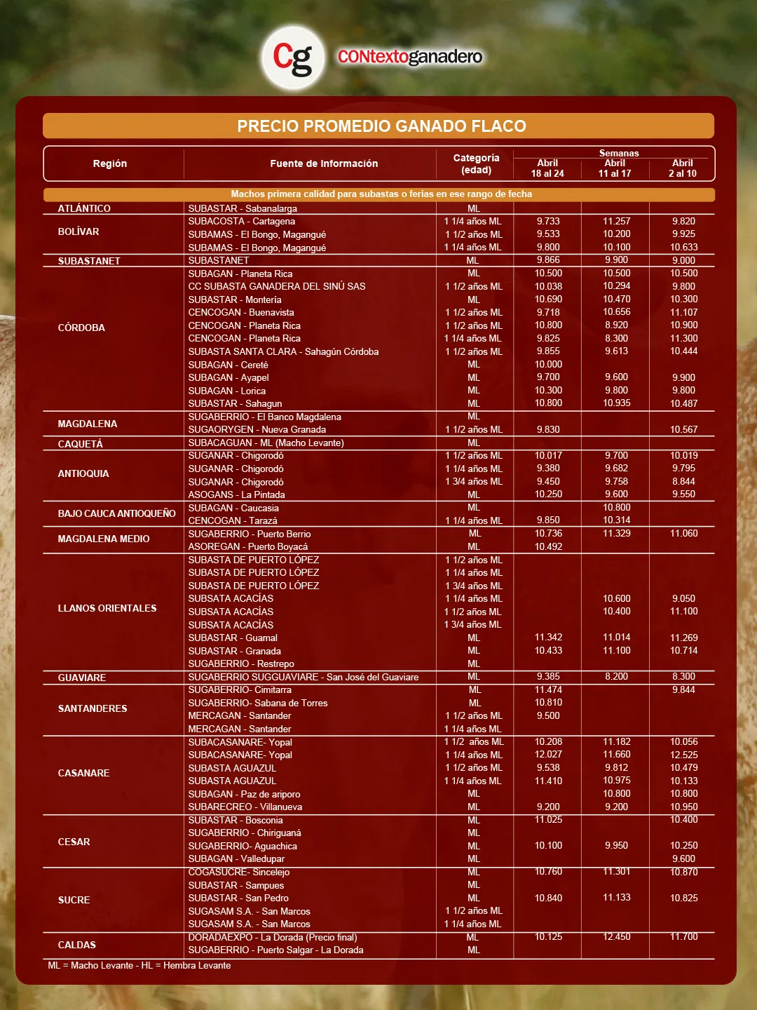A continuación, Contexto presenta las principales novedades del precio del ganado en subastas correspondientes al periodo del 18 al 24 de abril de 2026, con base en cifras de Fedegán-FNG.