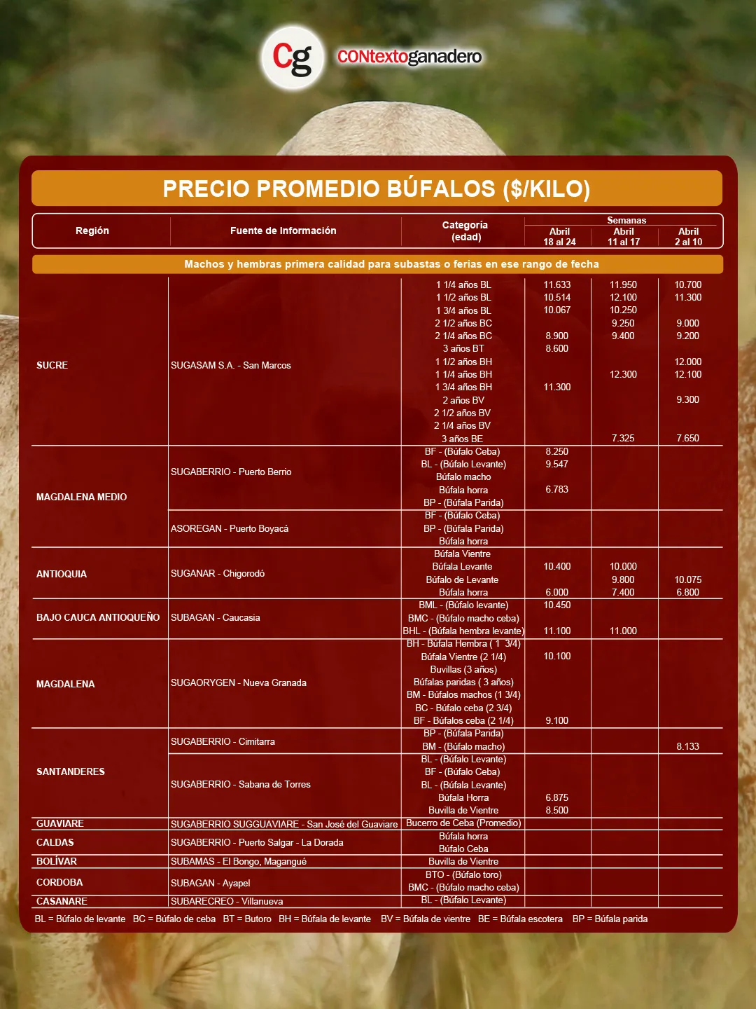 El mercado bufalino experimentó un ajuste tras el fuerte repunte de la semana pasada. Sugasam de San Marcos (Sucre) lideró como es habitual con búfalo de levante de 1¼ años (BL) con $11.633/kg y en búfala de levante de 1¾ años (BH) con $11.300/kg.