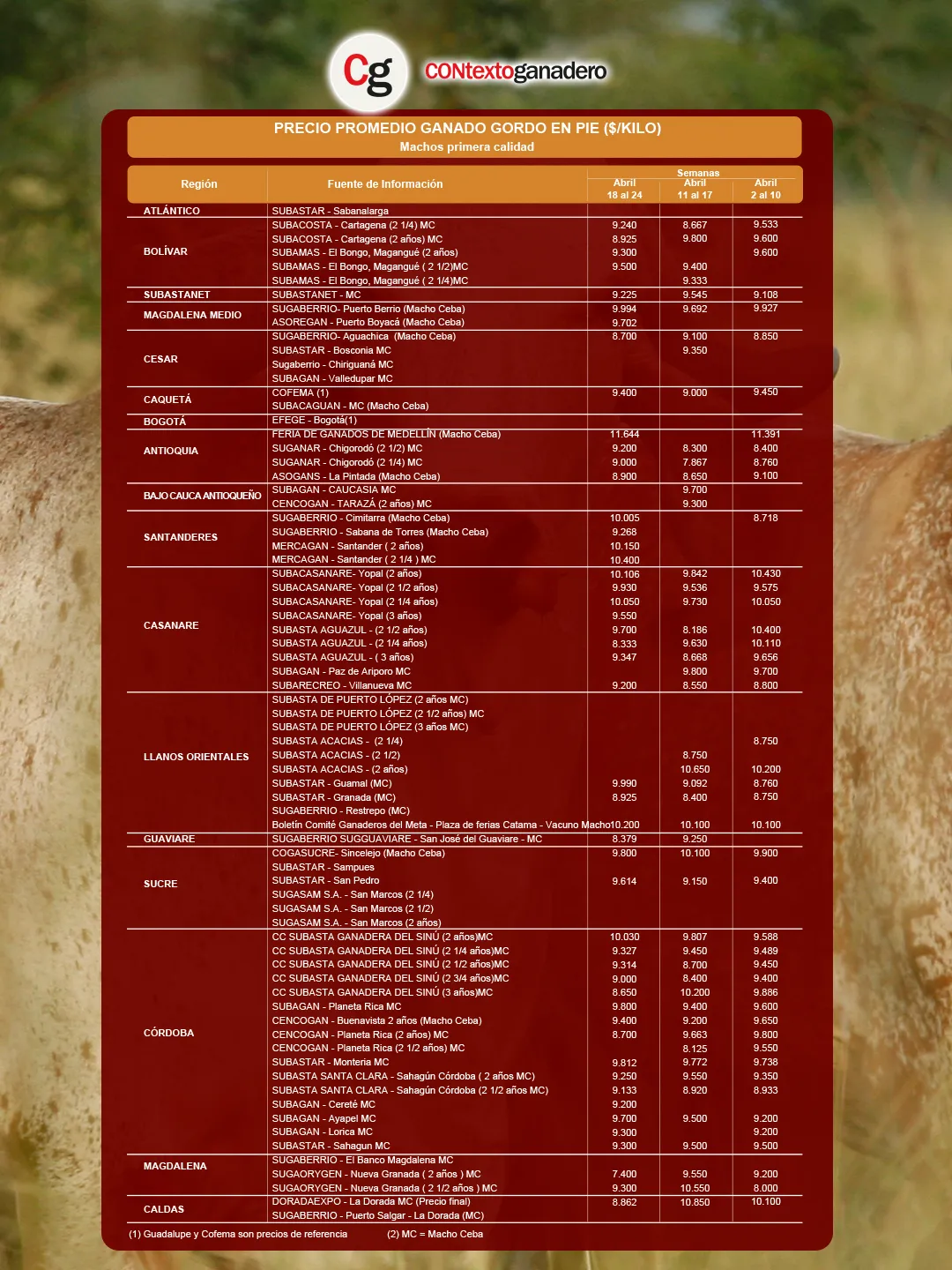 Medellín ratificó su condición de referente nacional en macho de ceba al encabezar el listado con $11.644/kg, siendo la única plaza que se mantuvo por encima de los $11.000. Le siguió Mercagan en Bucaramanga Santander, donde la categoría de 2¼ años alcanzío $10.400/kg y la Plaza de Ferias Catama (Meta) llegó a $10.200/kg. En cuarto lugar volvió a estar Mercagan con la categoría de 2 años, que se ubicó en $10.150/kg, y Subacasanare en Yopal (2 años) cerró el grupo en $10.106/kg.