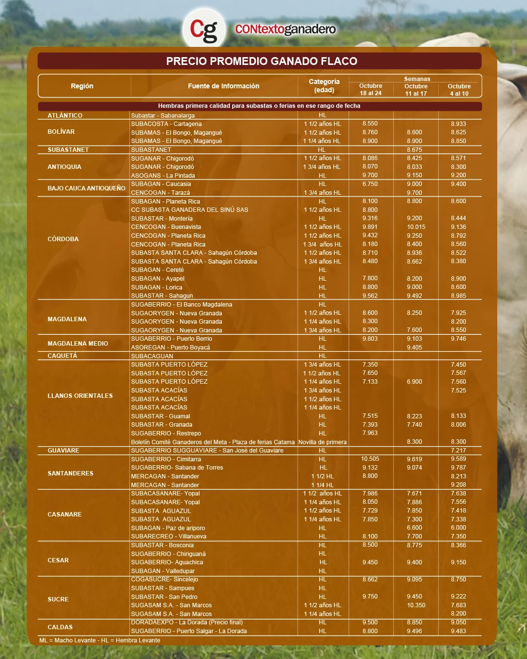 El promedio para este tipo de ganado en todas las subastas del país fue de $8.981/kg, una relativa estabilidad con una leve caída de 0,3 %. (Lea en CONtexto ganadero: Montería y Yopal marcan la pauta en los precios del ganado a mitad de octubre)
