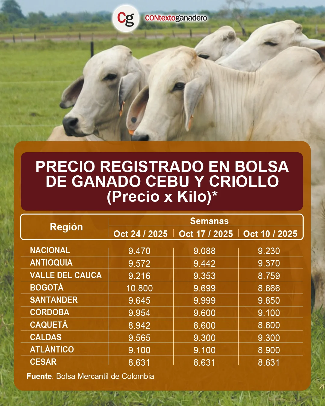 De acuerdo con la Bolsa Mercantil de Colombia, Bogotá registró el valor promedio más alto del país para el ganado gordo comercial, con $10.800/kg. Además, fue la región con el mayor incremento semanal, al subir $1.101, equivalente a un 11,4 %.
