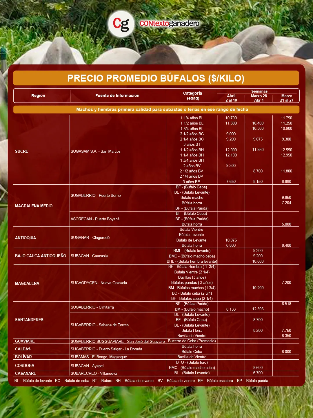 El mercado bufalino volvió a ser liderado por Sugasam en San Marcos (Sucre), que ocupó las primeras posiciones con la búfala de levante (BH) de 1 ¼ años ($12.100/kg) y 1 ½ años ($12.000/kg).