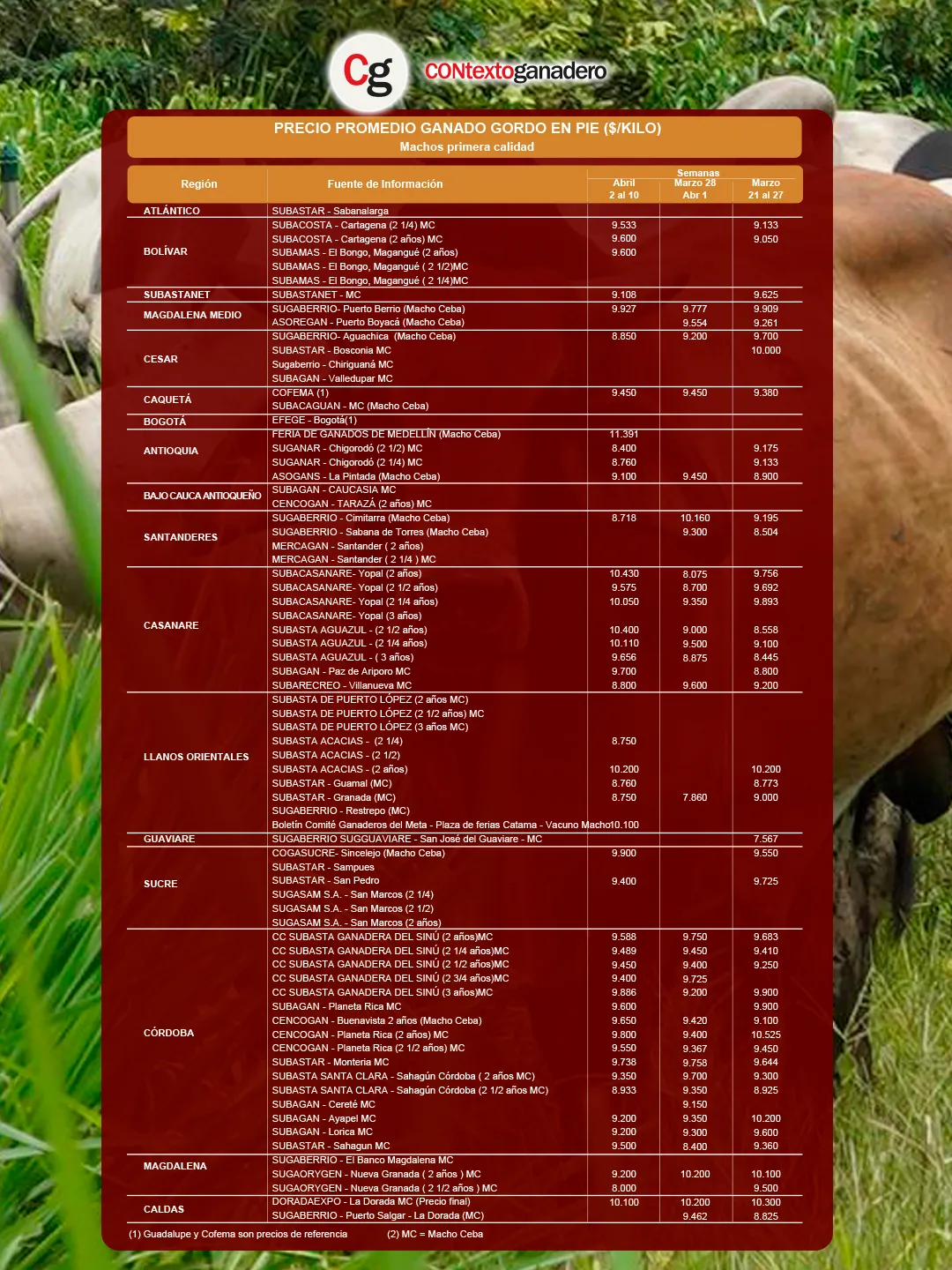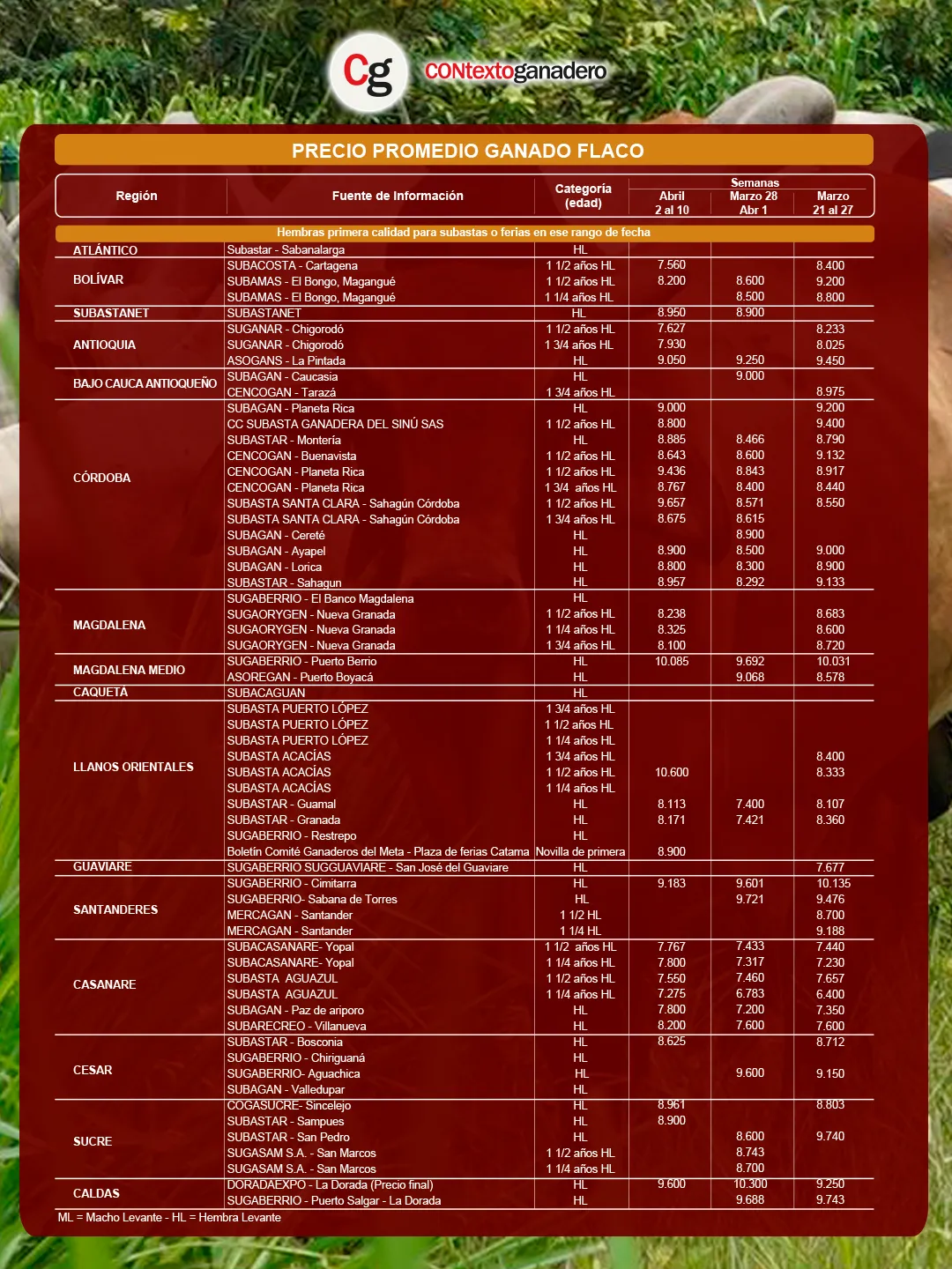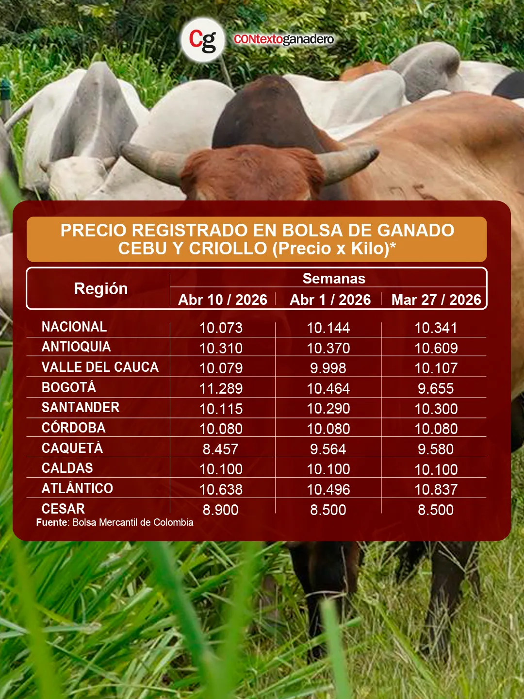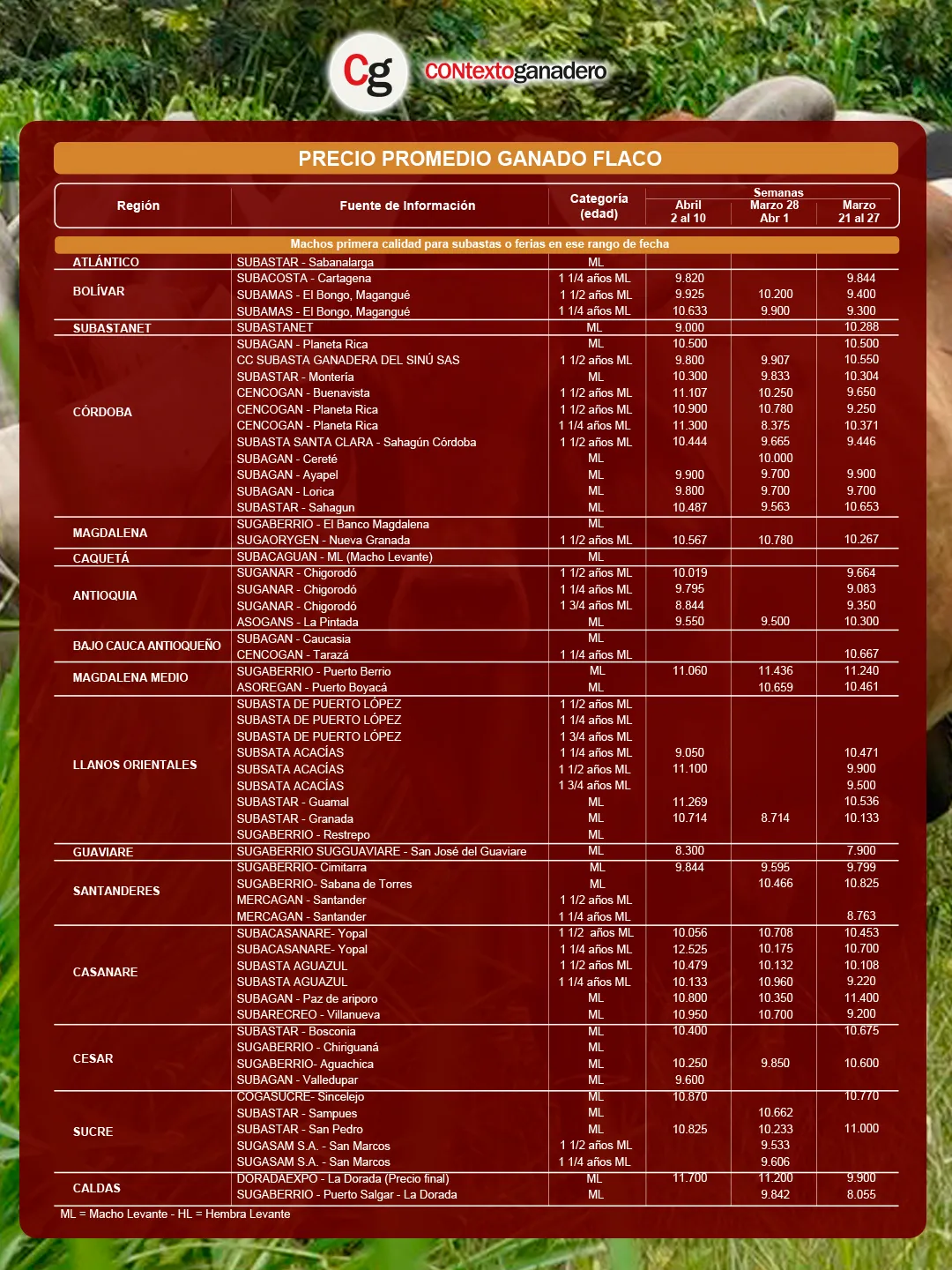 Tanto el promedio del macho gordo como el del macho de levante subieron tras la pausa de la Semana Santa, consolidando una recuperación para algunas de las plazas. Por su parte, la Bolsa Mercantil registró una leve caída pese al fuerte incremento de Bogotá, que se posicionó en el primer lugar con el mejor precio a nivel nacional.