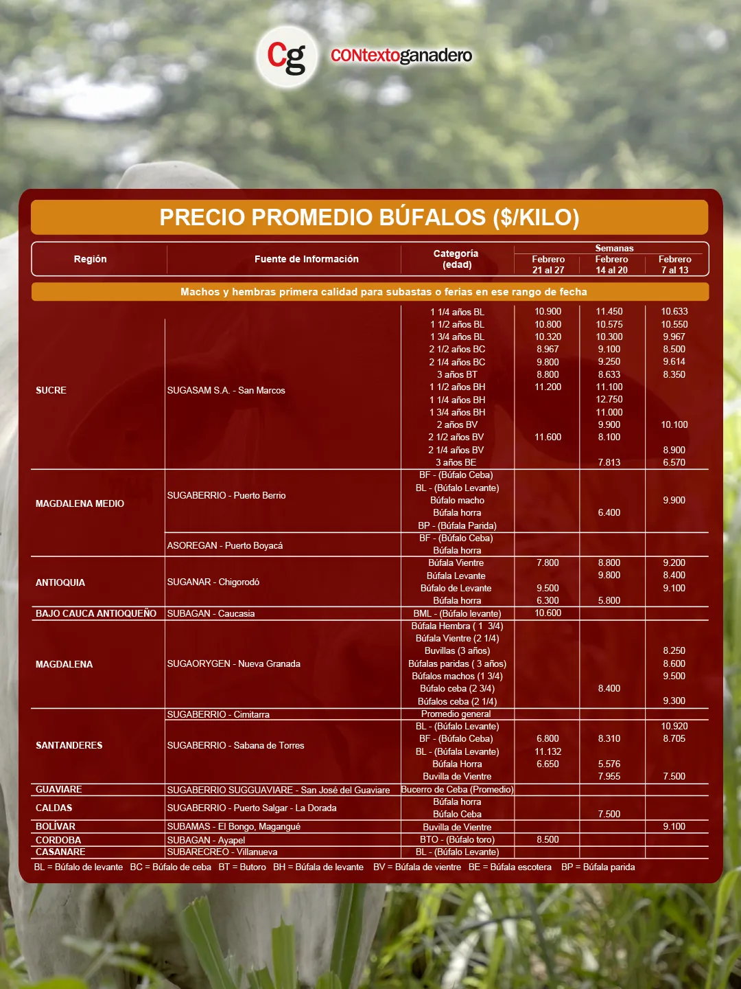 Sugasam en San Marcos (Sucre) volvió a marcar la pauta en los precios de búfalos. La categoría mejor cotizada fue la búfala de vientre (BV) de 2 ½ años, que alcanzó $11.600/kg y registró, además, el mayor incremento semanal: un sorprendente 43,2 % ($3.500) frente al valor anterior.