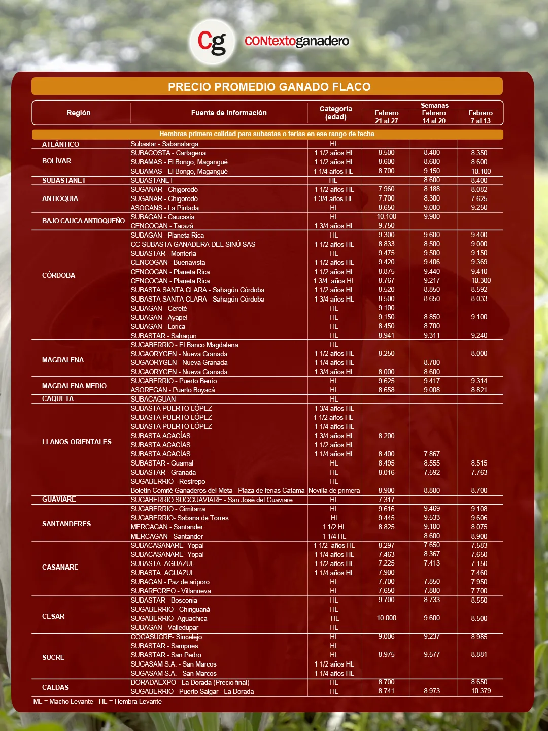 Subagán en Caucasia volvió a liderar los precios de hembra flaca o de levante de primera calidad (HL), al ubicarse en $10.100/kg. Esta cifra representa un incremento de $200 (2 %) frente al valor registrado la semana anterior.