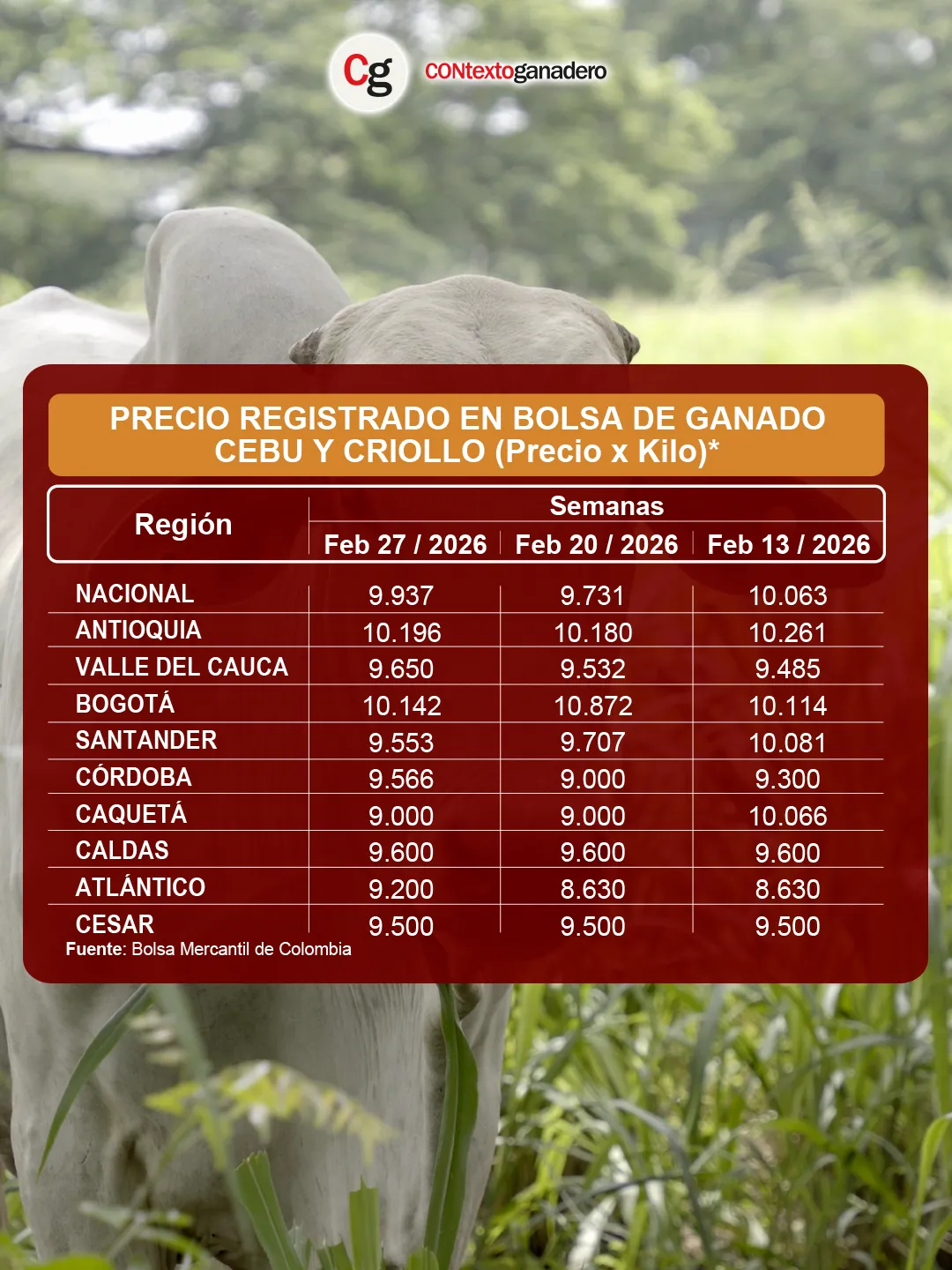 En las últimas semanas, Bogotá y Antioquia han venido alternándose el liderazgo en el precio del ganado gordo comercial, según el reporte de la Bolsa Mercantil de Colombia. En esta oportunidad, Antioquia recuperó la primera posición con $10.196/kg, mientras que la capital quedó en segundo lugar con $10.142/kg.