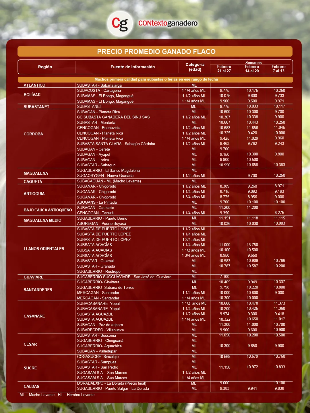 Al cierre del mes, la subasta con el mejor precio promedio de macho flaco o de levante (ML) fue Subagán en Paz de Ariporo (Casanare), que alcanzó $11.300/kg. Esta cifra representa un aumento de 2,7 % ($300) frente al registro de la semana anterior.