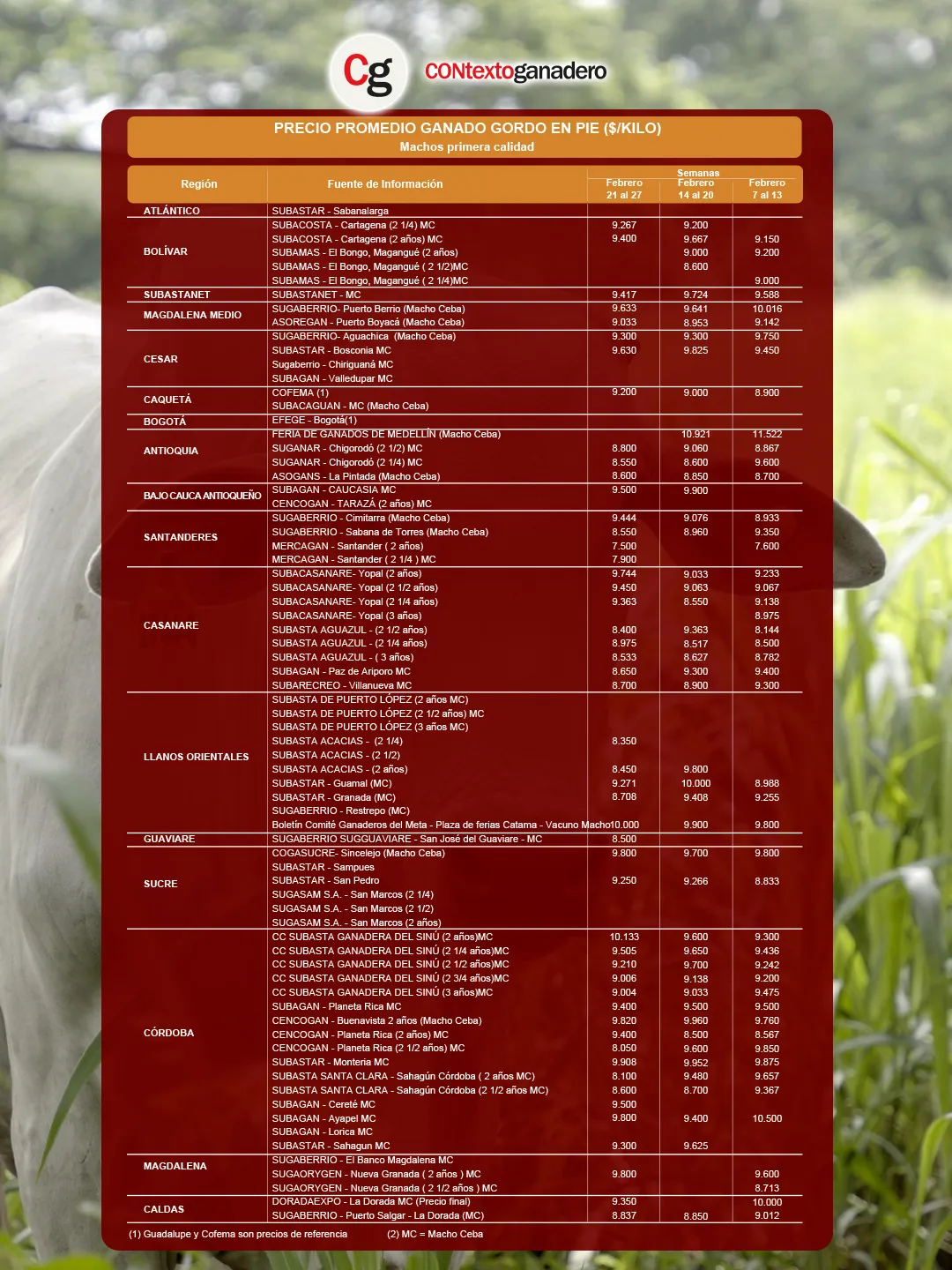 Como es habitual, la Feria de Ganados de Medellín ocupó el primer lugar con el mejor promedio en el precio de macho gordo o cebado (MC). Esta plaza cerró febrero alcanzando $11.261/kg. Esto representa un incremento de $340 (3,1 %) respecto al valor obtenido hace una semana.