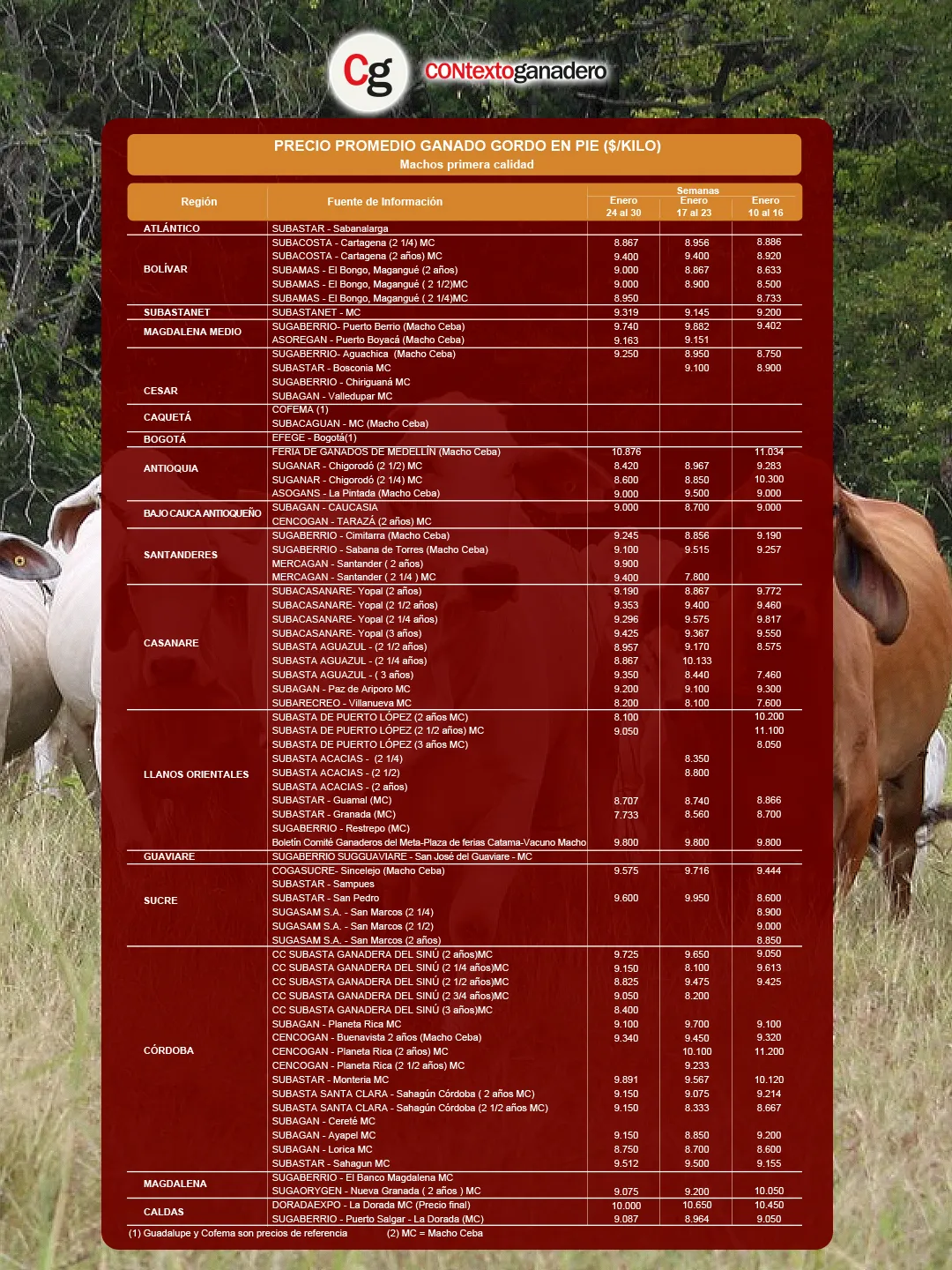 A continuación, CONtexto ganadero presenta las principales novedades del precio del ganado en subastas de la semana del 24 al 30 de enero, con base en los datos recopilados por la Oficina de Planeación y Estudios Económicos de la Federación Colombiana de Ganaderos y el Fondo Nacional del Ganado (Fedegán-FNG).