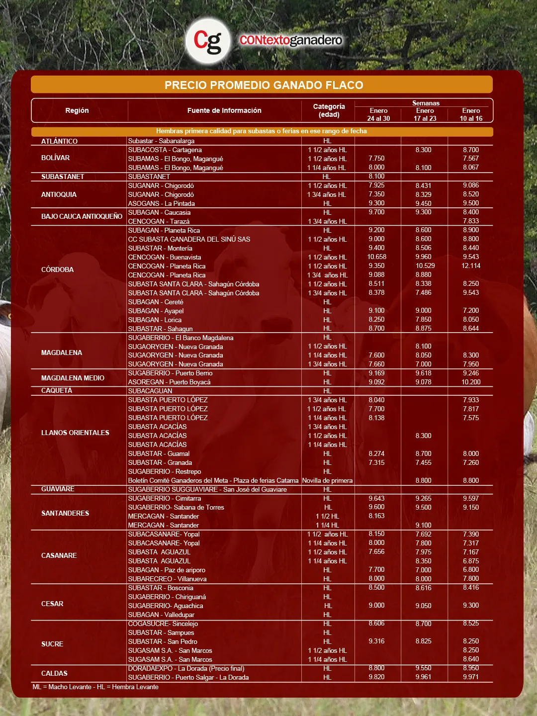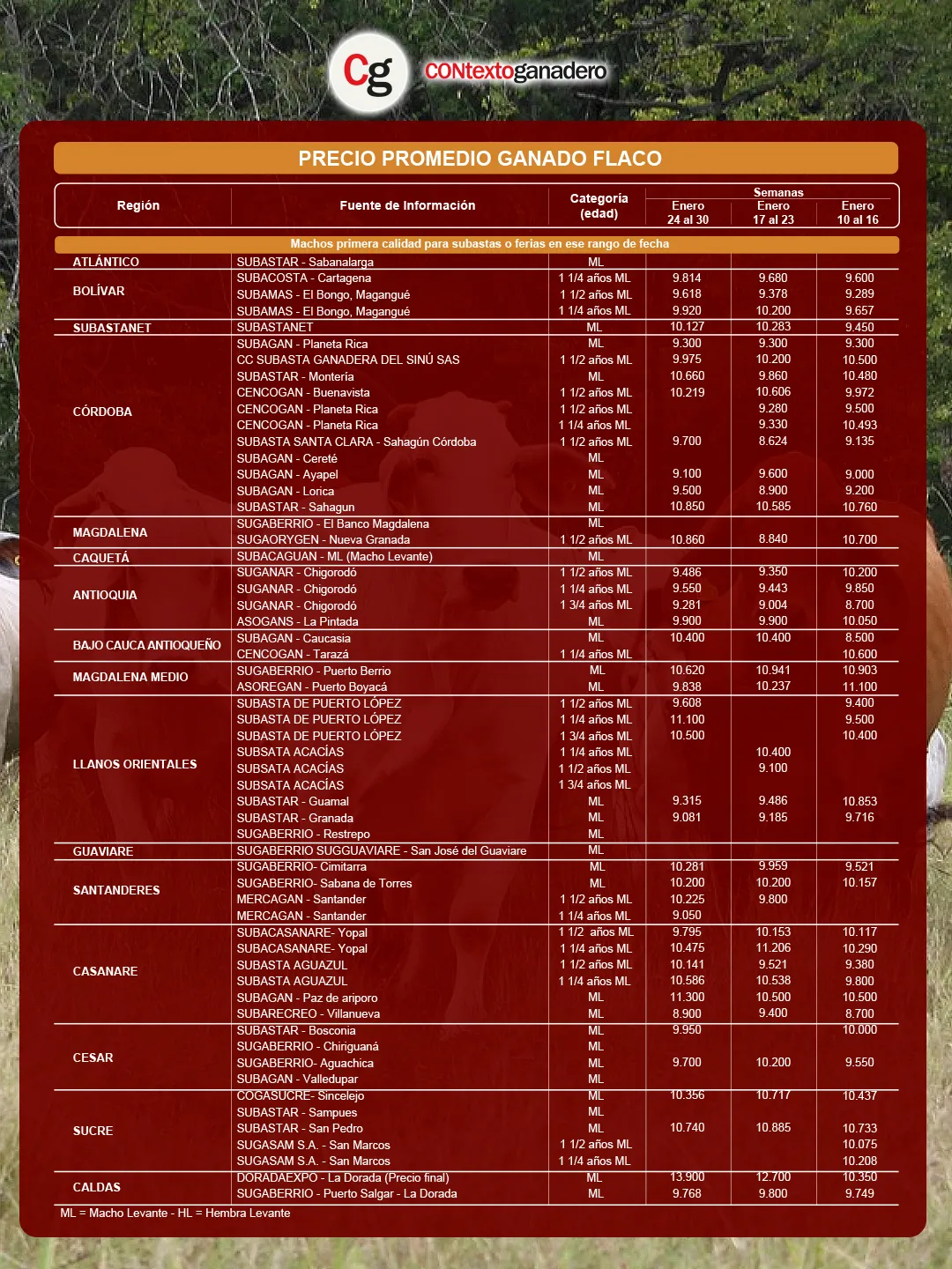 A continuación se ubicaron Subagán en Paz de Ariporo (Casanare), con $11.300/kg, y la subasta de Puerto López (Meta), donde la categoría de ML de 1 ¼ años llegó a $11.100/kg.