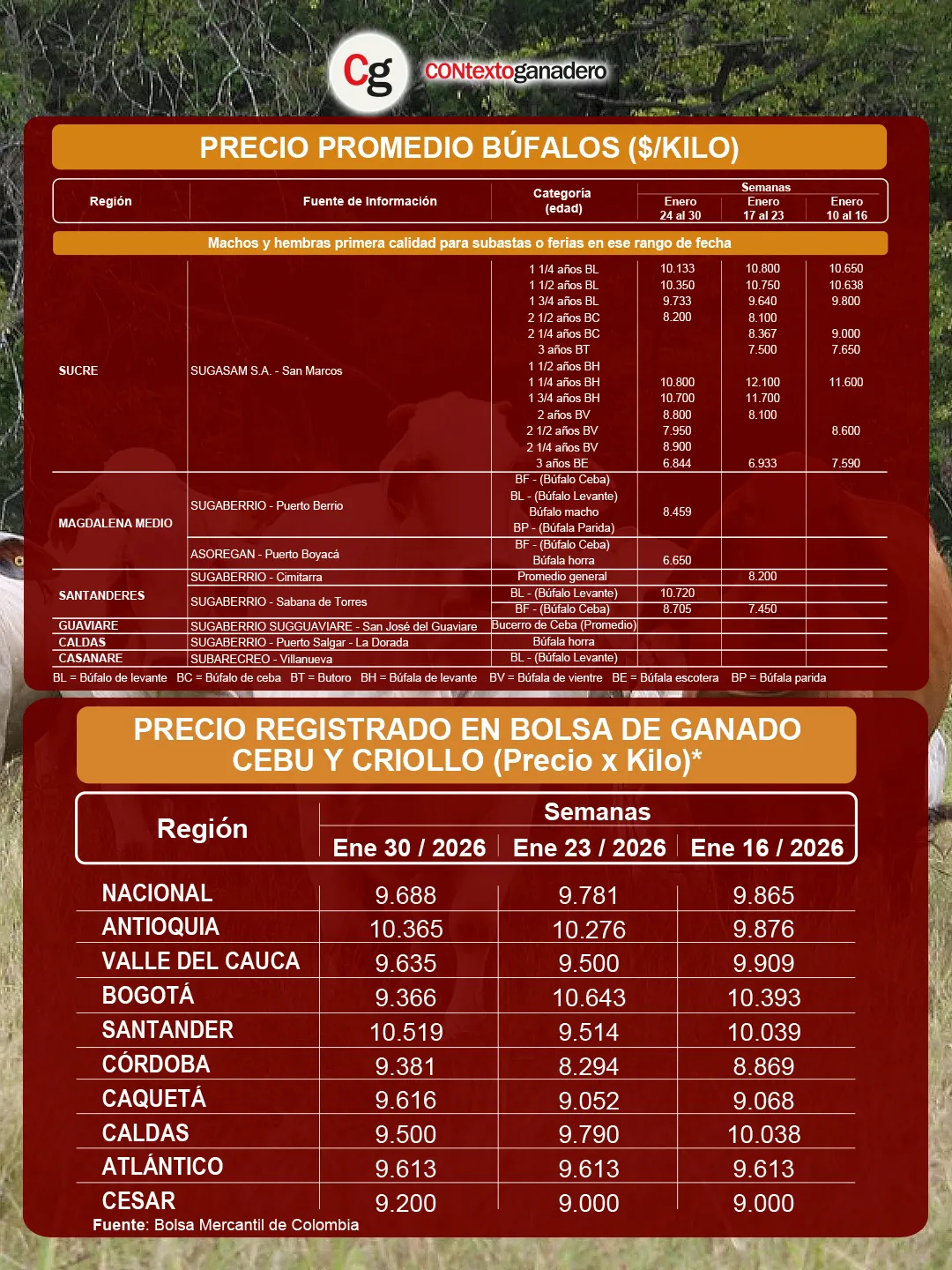Las dos que cerraron el top 5 fueron Sugaberrío de Cimitarra (Santander) con $9.643/kg y Sugaberrío de Sabana de Torres con $9.600/kg. (Lea en CONtexto ganadero: Arranca 2026 con fuertes alzas en precios del ganado en todo el país)