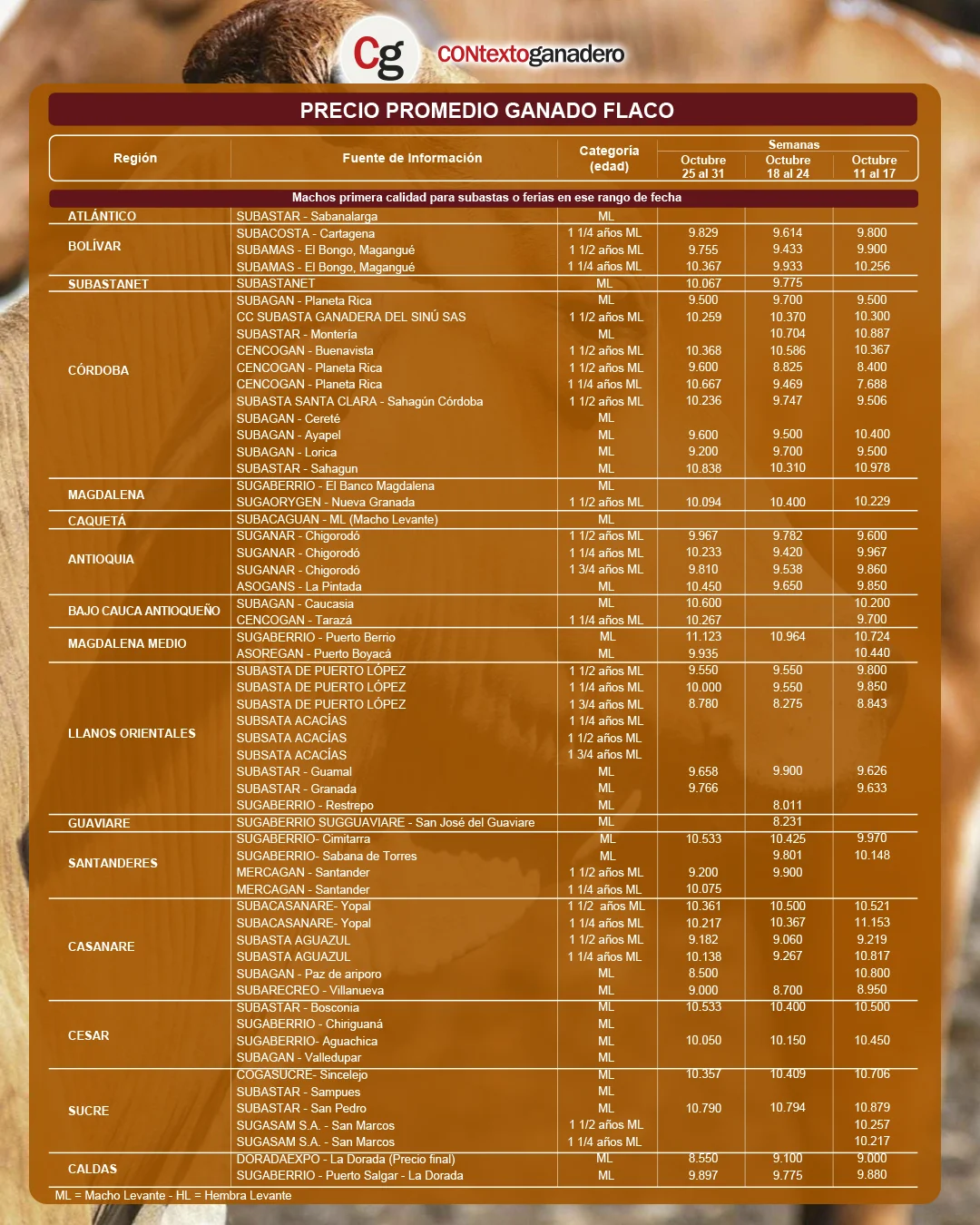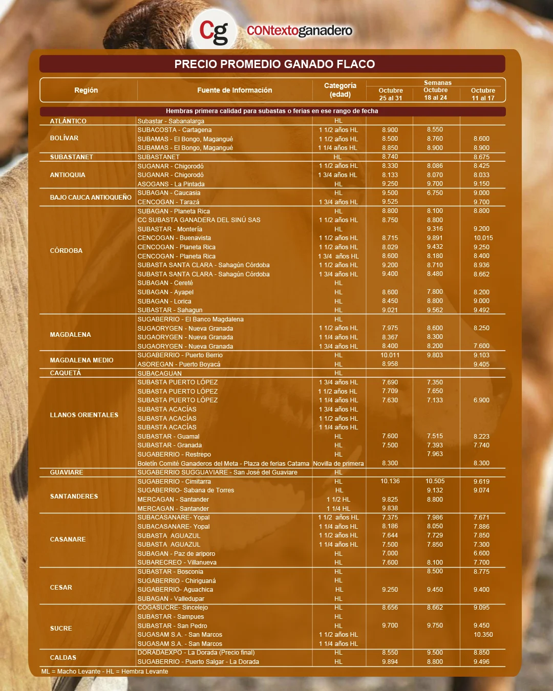 La mejor cotización para la hembra de levante (HL) en el cierre de octubre volvió a registrarse en Sugaberrío en Cimitarra (Santander), con un promedio de $10.136/kg, aunque esta cifra fue $369 menor que la semana anterior.