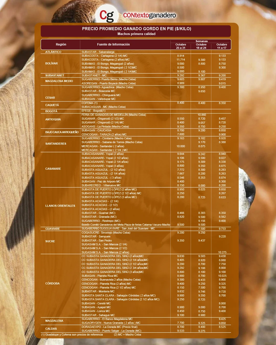 La última semana de octubre dejó cifras inéditas en el mercado ganadero, con Cartagena imponiendo un nuevo máximo de macho gordo en 2025 y Puerto Berrío liderando el de levante. En hembras, Cimitarra volvió a ocupar el primer lugar, mientras que la subasta búfala de Sugasam fijó el mayor valor del año.