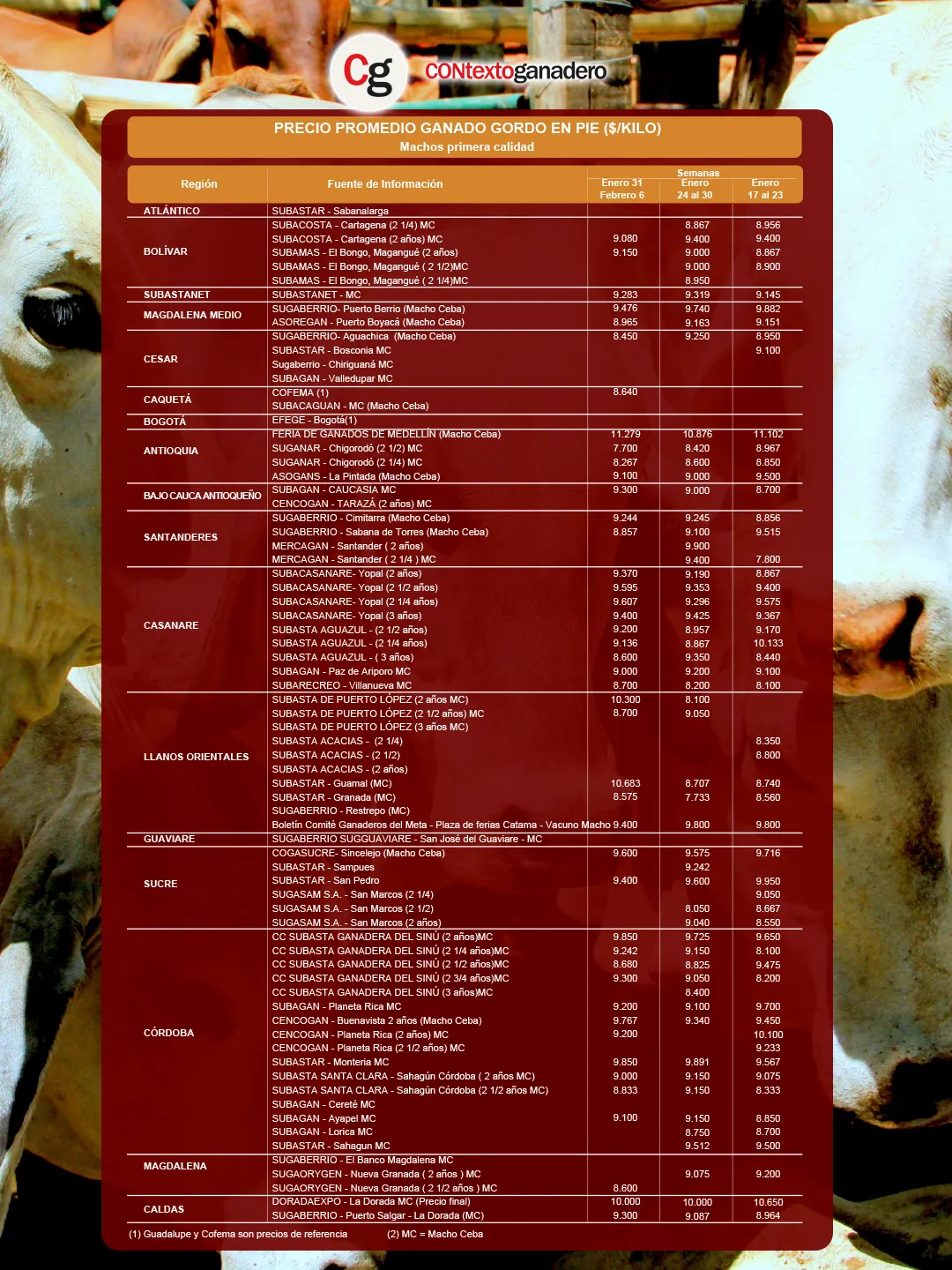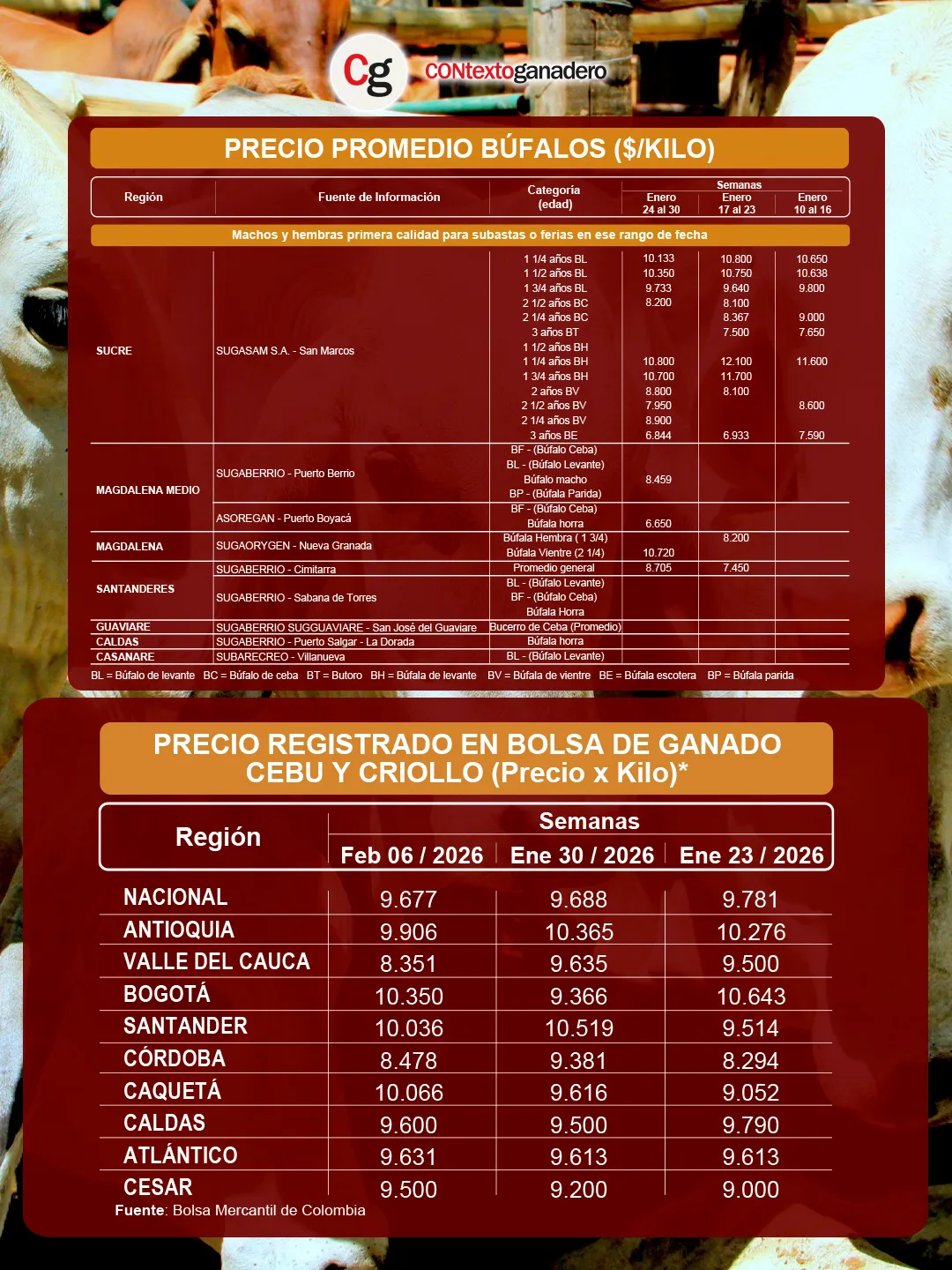 A continuación, CONtexto ganadero presenta las principales novedades del precio del ganado en subastas de la semana del 31 de enero al 6 de febrero de 2026, con base en los datos recopilados por la Oficina de Planeación y Estudios Económicos de la Federación Colombiana de Ganaderos y el Fondo Nacional del Ganado (Fedegán-FNG).