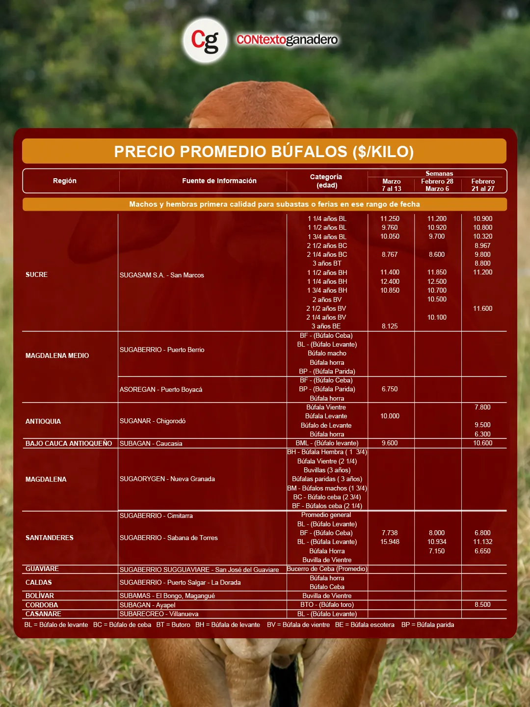 En cuanto al consolidado nacional, el promedio de todas las subastas fue de $9.324/kg, $152 o 1,7 % más que el de la semana pasada. (Lea en CONtexto ganadero: Subastas arrancan marzo con fuertes alzas en los precios del macho de levante y búfalos)