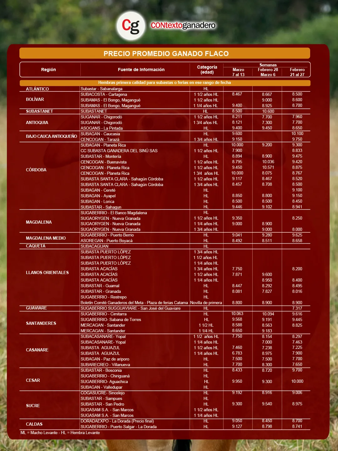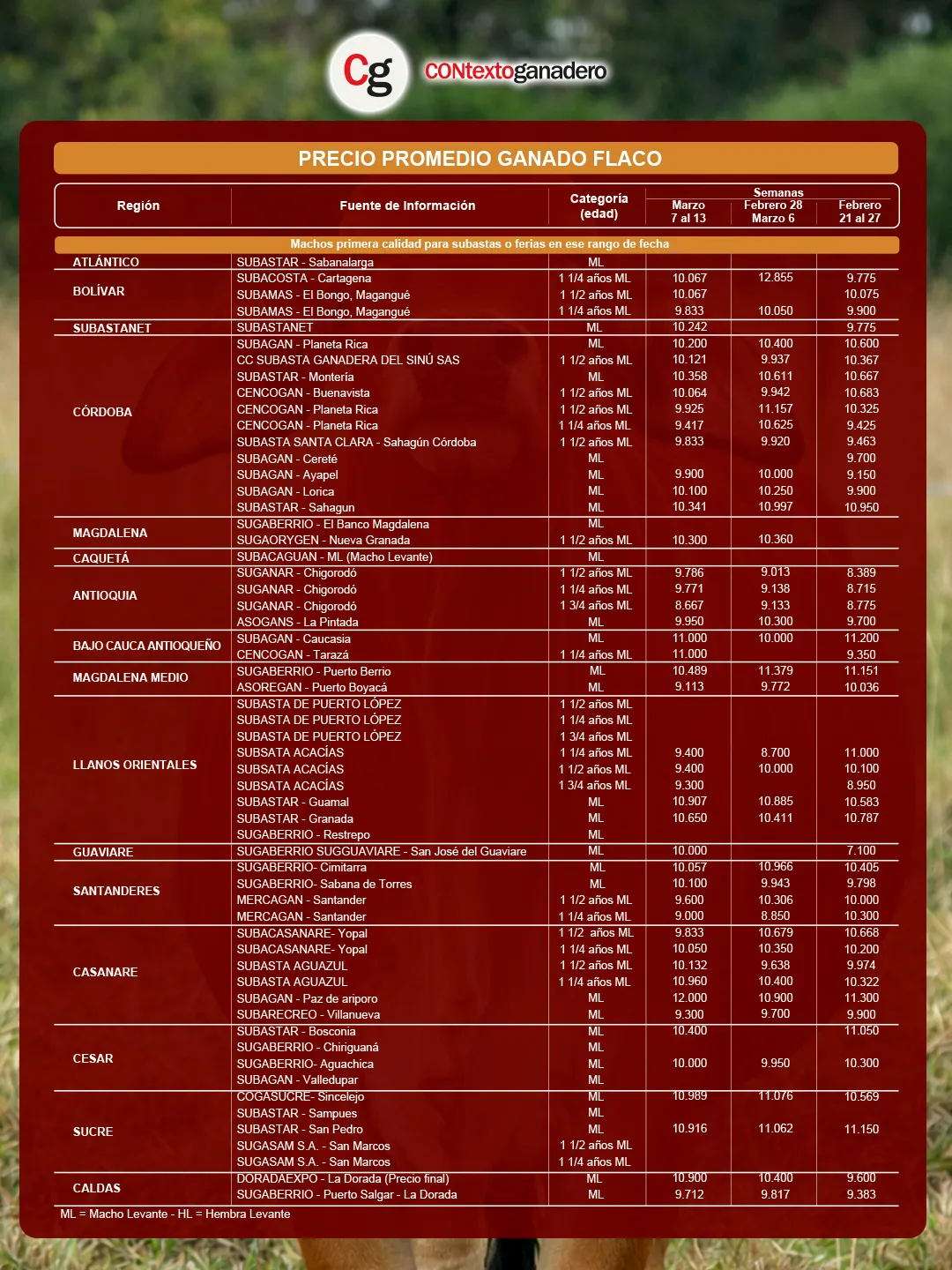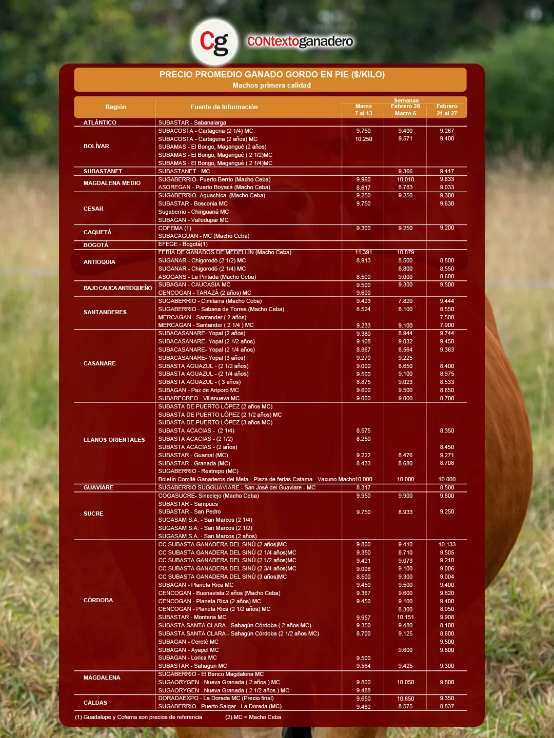 De acuerdo con el informe del precio del ganado gordo comercial de la Bolsa Mercantil de Colombia, Atlántico inició marzo con el valor más alto y repitió en la segunda semana, al registrar $10.543/kg, el mismo nivel de hace siete días.