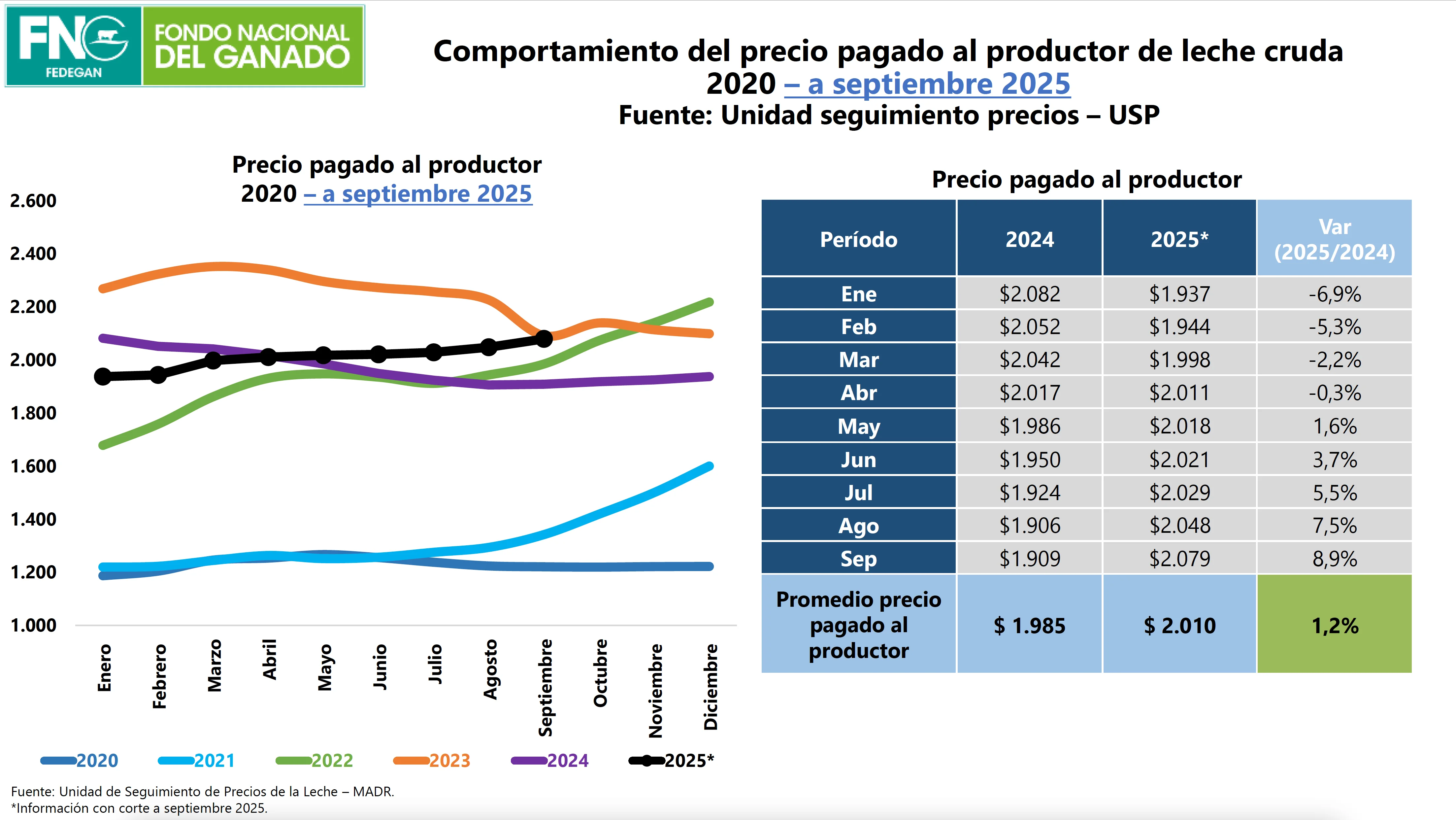 Con corte al 30 de septiembre, el valor promedio del litro a nivel nacional fue de $2.079, un 8,9 % más que en el mismo mes del 2024. (Lea en CONtexto ganadero: ¡Por fin buenas noticias para los lecheros! Aumenta el acopio y los precios se mantienen)