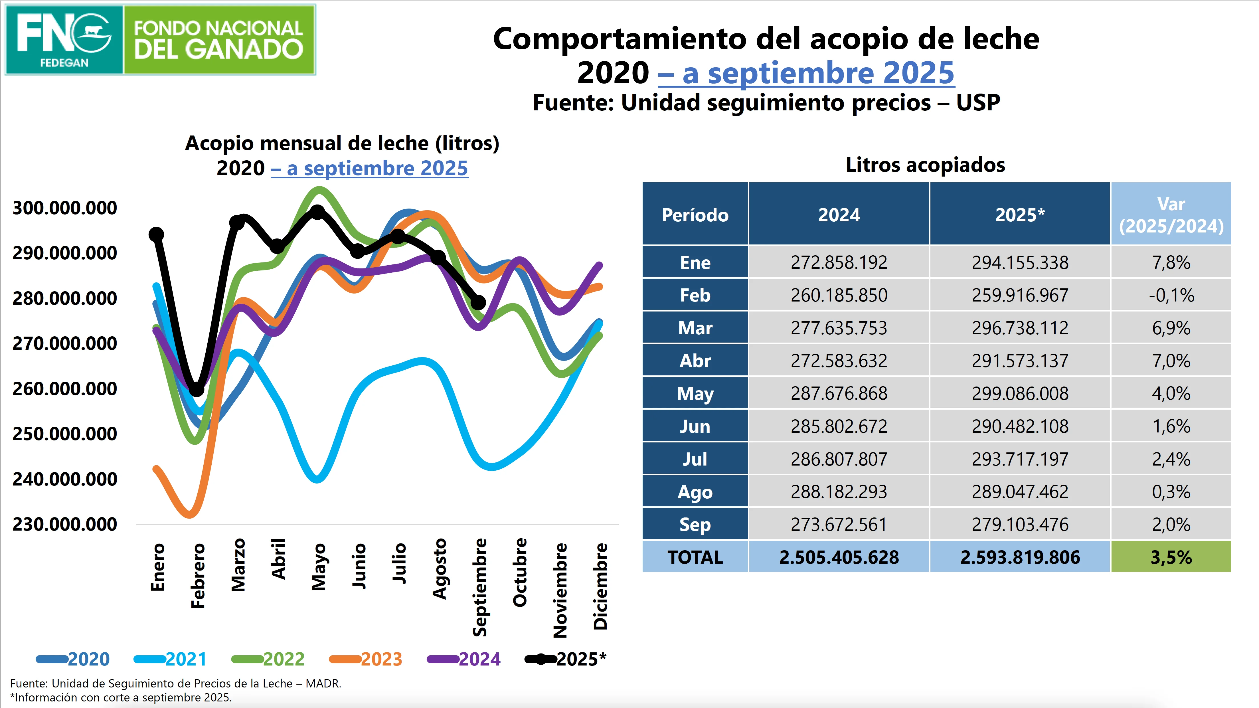 De acuerdo con la USP, entre enero y septiembre de 2025 las empresas formales reportaron un acopio de 2.594 millones de litros, un aumento de 3,5 % (equivalente a 88,4 millones de litros) frente al mismo periodo de 2024.