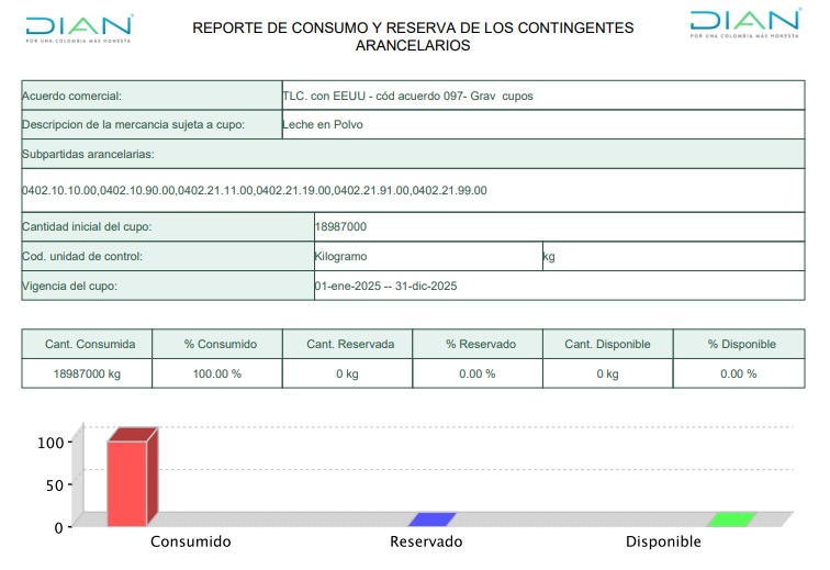 En un hecho clave para la ganadería colombiana, el contingente arancelario de leche en polvo importada bajo el Tratado de Libre Comercio (TLC) con Estados Unidos, que estaba establecido para 2025 en 18.987 toneladas, se agotó el pasado 31 de octubre.