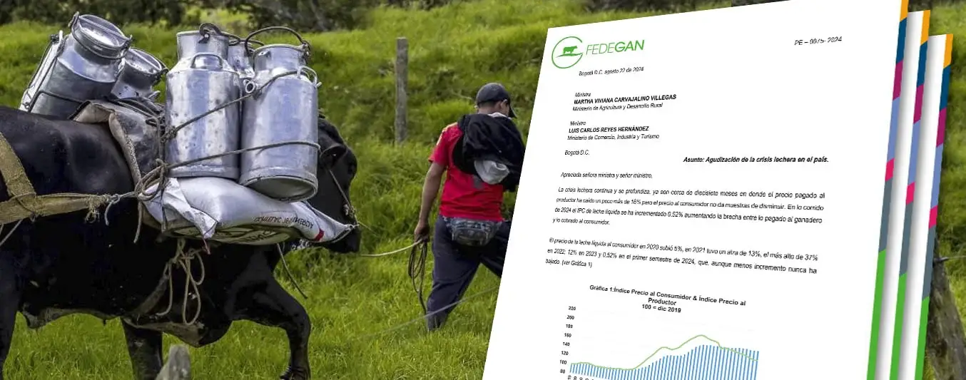 En una comunicación enviada a los ministros de Agricultura y de Comercio, el presidente ejecutivo de la Federación Colombiana de Ganaderos, Fedegán, denuncia que la crisis lechera, en lugar de amainar, se profundiza; pide la intervención de la Superintendencia de Industria y Comercio para investigar irregularidades y acuerdos entre empresas en relación con los precios pagados al productor; celeridad en la implantación de una medida compensatoria en el marco de los TLC y se pronuncia sobre el acuerdo que firmó Asoleche, con su homólogo en los Estados Unidos, el Consejo de Exportación de Lácteos de Estados Unidos (USDEC, por sus siglas en inglés).