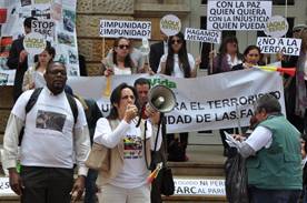 Desde las 11am hasta la 1pm, cerca de 100 personas acompañaron a la presidente de Fundagán, María Fernanda Cabal Molina y al presidente de Comité Vida, Fernando Vargas, para hacer visible la situación de las víctimas ganaderas ante la Corte Penal Internacional, CPI, en las instalaciones del Ministerio de Comercio Exterior.
