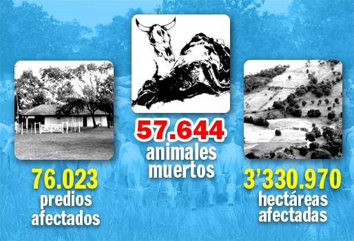Asimismo, en el reporte del gremio bovino se puede entrever que de los 393 mil 471 predios ganaderos ubicados en los departamentos de Sucre, Cesar, Córdoba, La Guajira, Bolívar, Magdalena, Atlántico, Tolima, Norte de Santander, Putumayo, Santander, Huila, Antioquia, Boyacá, Cundinamarca, Nariño y Caldas, 76 mil 23 han resultado afectados por el cambio climático que viene azotando al país desde finales de 2013. (Lea: El Niño ya genera escasez de alimentos en el Caribe)