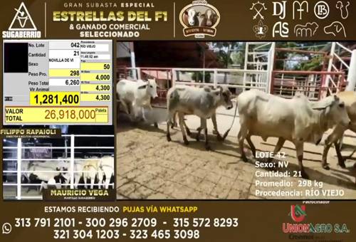 En palabras de Rapaioli, “tuvimos un precio promedio en los lotes F1 de $9.300 el kilogramo, que es el promedio más alto que hemos tenido hasta el momento. Todo esto, con un pico de $11.220 de la Ganadería Agropecuaria Lizcano Naranjo que mostraron unas terneras de hasta 260 kg de peso promedio”, asegura. .