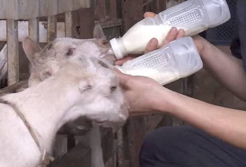 Los primeros días de vida los cabritos consumen alrededor de 125 gramos, posteriormente 250 y después de los 15 días de edad solo se les suministra dos teteros al día de dos porciones iguales, uno en la mañana de 500 gramos y el otro en la tarde para completar un litro.
