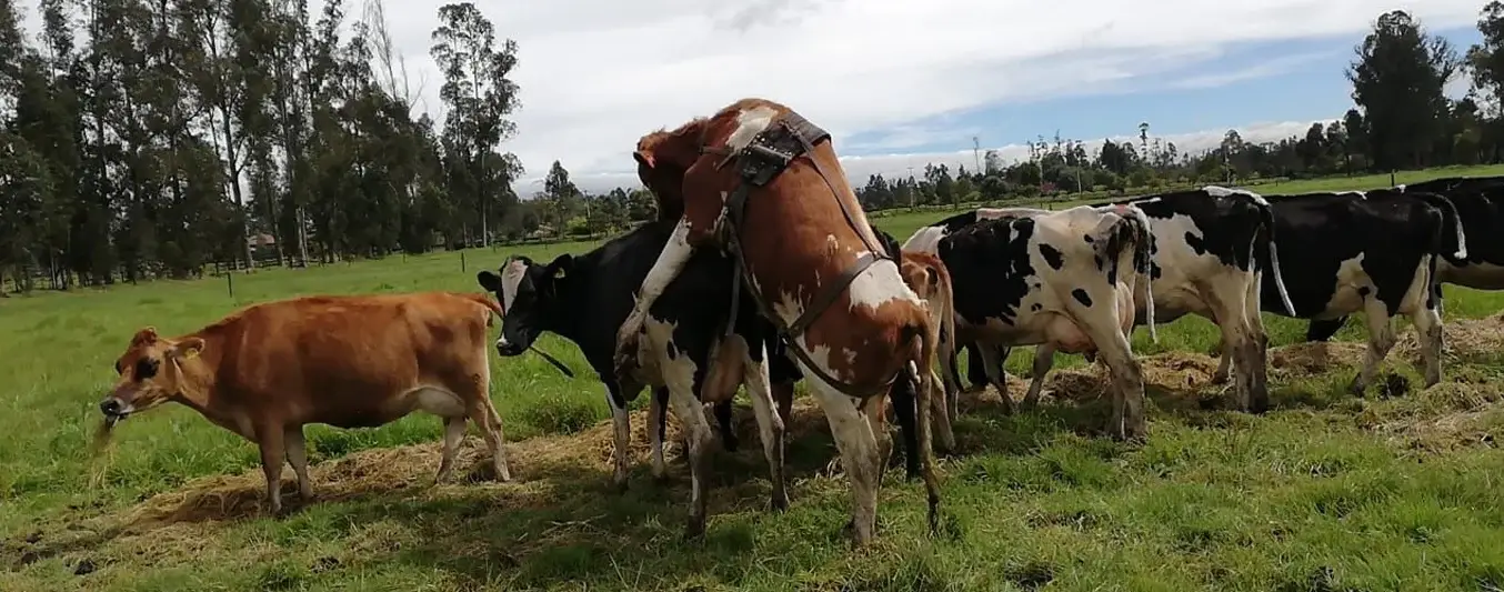 Caso real de toro montando vaca con el arnés que permite la detección del celo. Foto: Cortesía.