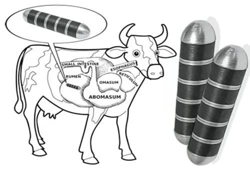 Básicamente, los imanes se emplean en bovinos para evita que las partículas metálicas tragadas por el animal lastimen o perforen el rumen o el retículo. Se calcula que un 70 % de los animales adultos pueden presentar cuerpos metálicos extraños en su organismo.