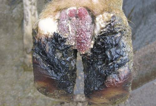 Posteriormente provoca necrosis, desarrollando una septicemia con dolor intenso, cojera, postración, fiebre, taquicardia, atonía ruminal y olor desagradable. Aunque causa pocas muertes, a veces hay que sacrificar a los animales o realizar la amputación de la tercera falange.