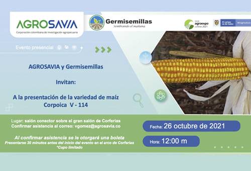 En el marco de Agroexpo 2021, Agrosavia presenta su nuevo material llamado CORPOICA -114 variedad de maíz de grano amarillo, que tiene alta producción de grano y forraje para la región Caribe de Colombia.