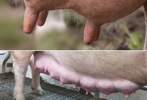 Según esta publicación, para todo hay excepciones: 2 pezones tienen ovejas, cabras, ciervas, yeguas, elefantas, camellas, primates, humanos; 4 pezones tienen las vacas; 6, las gatas; 8, las perras, 12 las cerdas ibéricas y hasta 16 cerdas blancas.