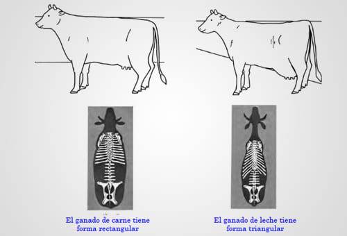 Al comparar la conformación ósea, el bovino de leche posee huesos delgados y un cuero fino, viéndose flacos y angulosos, a diferencia del bovino de carne que posee huesos y cuero más gruesos, con acumulación de grasa, por lo que se ven más robustos y curvilíneos.