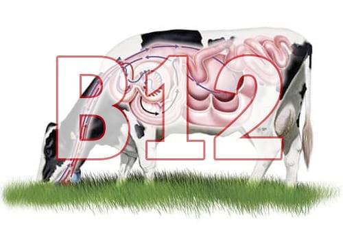 Se descubrió que ciertos microorganismos en el rumen están relacionados con la abundancia de vitamina B12. Las dietas ricas en fibra de detergente ácido, como la hierba, tendían a fomentar el aumento de las concentraciones de vitamina B12 en la leche.