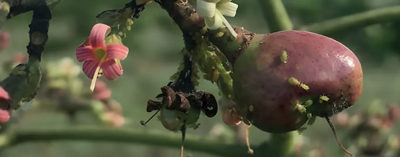 Áfidos Aphis gossypii y Aphis spiraecola (Hemiptera. Aphididae): Los áfidos o pulgones de esta especie son plagas polífagos, ya que atacan una gran variedad de cultivos. El daño lo producen por su alimentación, pues succionan la savia, lo cual produce marchitamiento o deformación de las inflorescencias, afectaciones que pueden disminuir los rendimientos del cultivo.