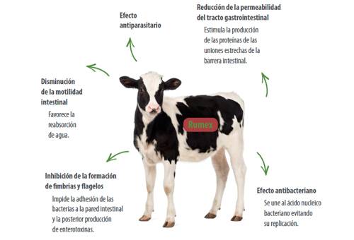 El fitoquímico que está resultando ser más efectivo frente a las diarreas es Rumex, un alcaloide que tiene diversos efectos beneficiosos: efecto antiparasitario, reducción de la permeabilidad del tracto gastrointestinal, disminución de la motilidad intestinal, efecto antibacteriano, inhibición de la formación de fimbrias y flagelos. (Lea: Nutra sus semovientes con alimentos no tradicionales)