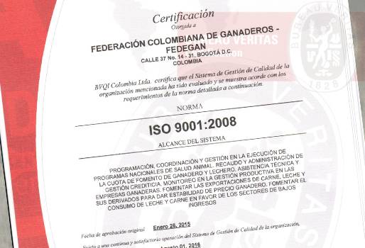 De acuerdo con Óscar Cubillos, coordinador de la oficina de Planeación del Fondo, la firma Bureau Veritas, entidad reconocida por la Organización Nacional de Acreditación de Colombia, Onac, dio su aval para que ‘Fomento al Consumo’ y ‘Estabilización de Precios’ cuenten a partir de ahora con la Certificación ISO 9001:2008. (Lea: Fondo Nacional del Ganado, 20 años de una gestión efectiva y transparente)