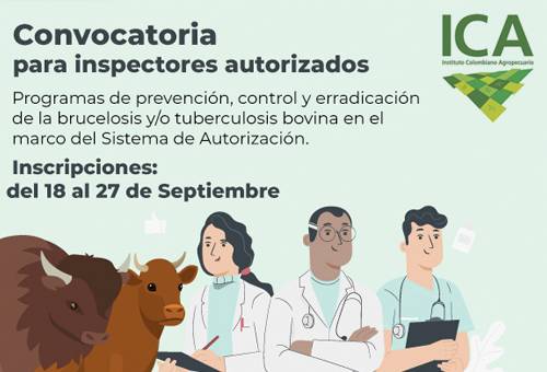 Los profesionales interesados en recibir del Instituto la autorización que los faculta como inspectores para la atención de actividades relacionadas con estas dos enfermedades de control oficial, pueden conocer los términos de referencia de esta convocatoria en la página web del ICA: www.ica.gov.co. y médicos veterinarios-zootecnistas se inscriban al “curso taller y examen de competencias técnicas”, de los Programas Nacionales de Brucelosis y Tuberculosis Bovina.