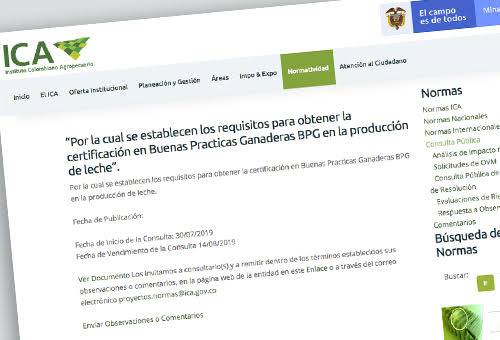 El Instituto Colombiano Agropecuario, ICA establece unos requisitos para obtener la certificación en BPG para la producción de leche. El inicio de la consulta pública se realizó el 30 de julio de 2019 y va hasta el 14 de agosto del mismo año. Su objeto es establecer los requisitos que deben cumplir los predios dedicados a la producción primaria de leche para obtener la certificación en buenas prácticas ganaderas. (Lea: Aumentan certificaciones en BPG a predios productores de carne bovina)