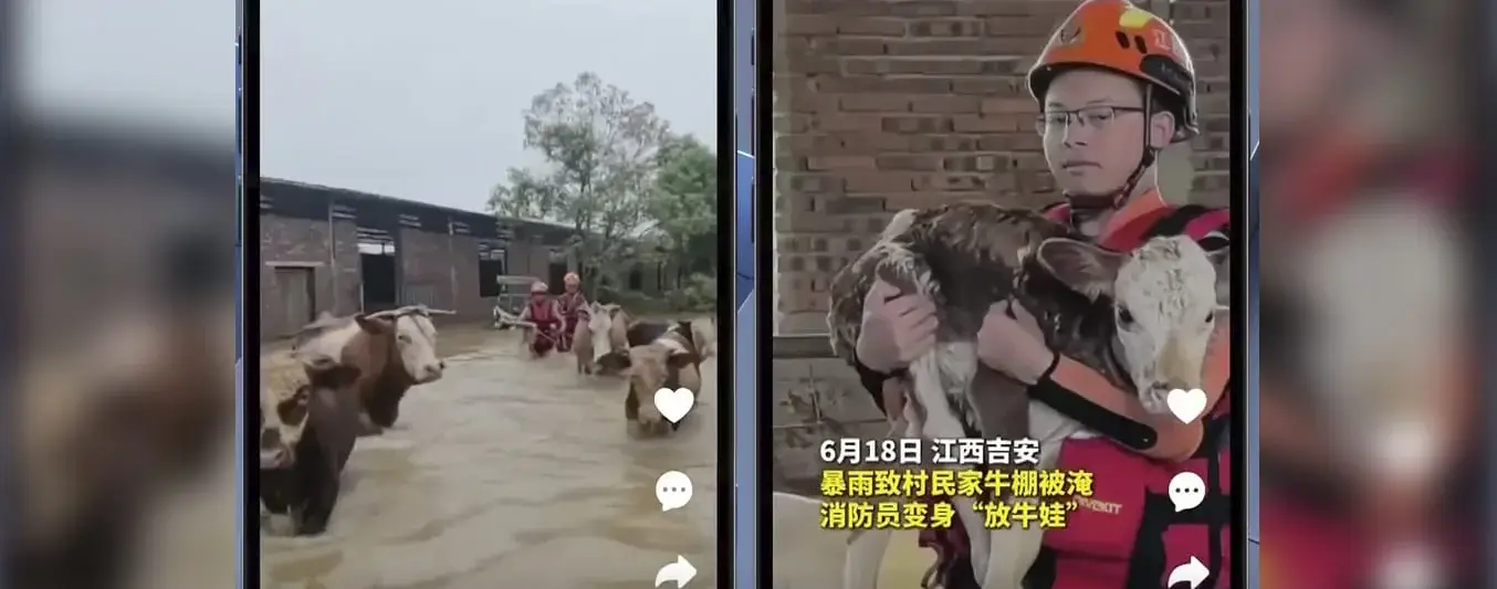 En la ciudad de Xian, China, los bomberos demostraron una vez más su dedicación y valentía al rescatar a unas vacas y sus terneros atrapados por fuertes aguaceros. Las intensas lluvias provocaron severas inundaciones, dejando a los animales atrapados en su establo sin posibilidad de escape. La situación requería una intervención rápida y efectiva para salvar a los animales de una tragedia inminente.