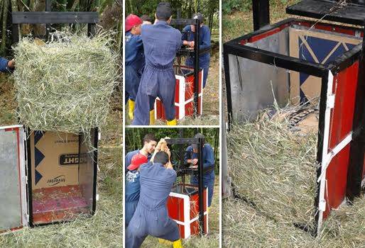 Así funciona la compactadora de heno. Video: Cortesía César Augusto Urón Castro. César Augusto Urón Castro, docente de la asignatura, aseveró que el primer acercamiento al dispositivo, 100 % manual, consta de una estructura compuesta por un gato hidráulico que permite que una especie de prensa vaya bajando y con un acelerador de gatillo se devuelva automáticamente al punto inicial. Eso permite que a través de la presión se vaya formando la paca de heno, para posteriormente amarrarla y conservarla. Así se aprovecha la oferta que hay en los predios. (Lea: Jóvenes desarrollan rascador para ganado que mejora calidad de carne) Para Urón Castro, la gestión que se está adelantando desde su cátedra ha permitido que se combinen muchos saberes, ya que ha permitido que estudiantes de otras carreras como ingeniería mecánica se vinculen en asuntos de soldadura o conceptos específicos de lo que están estudiando, mientras que quienes hacen parte de Zootecnia llevan a cabo los procesos operativos, para posteriormente llevarles los equipos a los ganaderos. “De forma interna manejamos el concepto de la extensión rural a través de una materia con dicho nombre, en donde estamos utilizando los equipos que se han desarrollado para que los estudiantes los lleven a las fincas, muestren a los productores y así facilitarles esas actividades”, indicó. En los próximos días se va adelantar un proyecto piloto con maíz picado para hacer silo y envolverlo, buscando obtener pacas con ese alimento y almacenarlo. La idea es prestarles ese servicio a aquellos productores que no tienen las maquinarias ni los recursos para acceder a ese tipo de tecnología. (Lea: Los beneficios de las máquinas para ensilar en la ganadería) “Esta es una máquina que nos permite hacer muchas pruebas buscando no solo compactar heno, sino otro tipo de productos, por lo que queremos llegar a un bloque ideal para brindarles a los animales en los momentos de crisis”, sentenció Las maquinarias son desarrolladas con materiales de bajo costo, reciclados o amigables con el medio ambiente; todo eso redunda en mayores bondades para las explotaciones y denotan las capacidades que tienen los estudiantes para sacar adelante los proyectos.