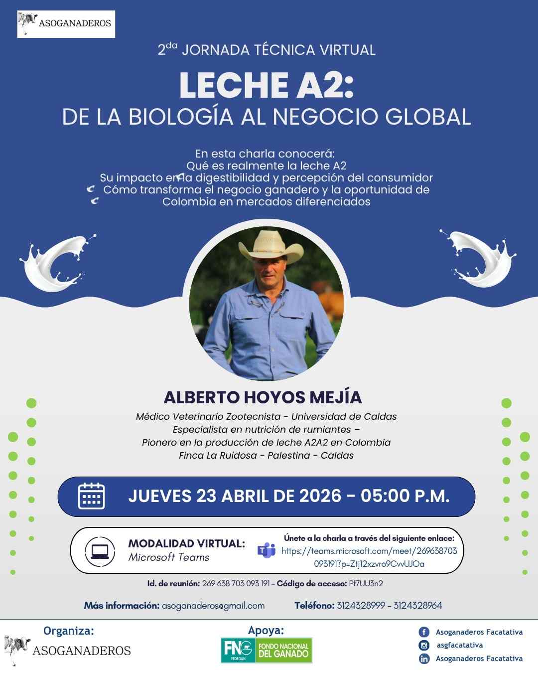 Alberto Hoyos Mejía, médico veterinario y pionero en la producción de leche A2 en Colombia, compartirá su experiencia transformando un hato convencional en la 2ª Jornada Técnica Virtual de Asoganaderos. El encuentro abordará el potencial de este producto diferenciado para recuperar consumidores, fortalecer la industria nacional y abrir puertas en mercados internacionales.