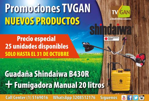 Adquiera una nueva guadaña con todos sus accesorios gracias a la increíble promoción de la mejor vitrina ganadera de Colombia, que para este mes ofrece este equipo en combo con otras herramientas un precio inmejorable. Con esta maquinaria, usted podrá realizar tareas como retirar malezas, cortar los arbustos o simplemente pulir el aspecto de su pradera, sin desgastarse tanto a la hora de realizar mucho esfuerzo. (Lea: Prepárese para la época seca gracias a esta promoción de TVGAN) Teniendo como objetivo el bienestar de los ganaderos y sus empleados, TVGAN ofrece esta herramienta para evitar el uso de machete o de una guadaña, proporcionando diversas ventajas como ahorro de tiempo o de trabajo a la hora de mantener cultivos y organizar potreros. Durante este mes de octubre, ha puesto a disposición de los ganaderos la novedad de la empresa japonesa Shindaiwa, la guadañadora B430R con eje giratorio y tubo exterior de 28 mm, motor de 42.7 cc y arnés de conexión rápida y hebilla de liberación lateral. Este equipo está diseñado especialmente para cortar hierba espesa y malezas pesadas, tiene bajo consumo de combustible y caja de engranajes de una larga vida útil. (Lea: Equipos que usted debería tener en su predio ganadero) La guadañadora incluye 6 accesorios para su mejor desempeño: el arnés profesional, pinta aceite Shindaiwa, 2 cuchillas Corbatín, frasco mezclador, tubo de grasa y gafas de protección. Además de esta herramienta, TVGAN añade a la promoción una bomba de espalda manual de 20 litros, para que usted también fumigue cultivos y praderas con toda facilidad. No pierda esta oportunidad, solamente hay 25 unidades disponibles con precio especial hasta el 31 de octubre de 2018 o hasta agotar existencias. (Lea: Promocione sus animales en TVGAN con un video grabado por usted mismo) Si usted está interesado en la promoción, puede ponerse en contacto con nuestros asesores los teléfonos en Bogotá (1) 5160916 o al Whatsapp interactivo 320 8512176. También ingrese a la página www.tvgan.com.co o escriba al correo electrónico [email protected].