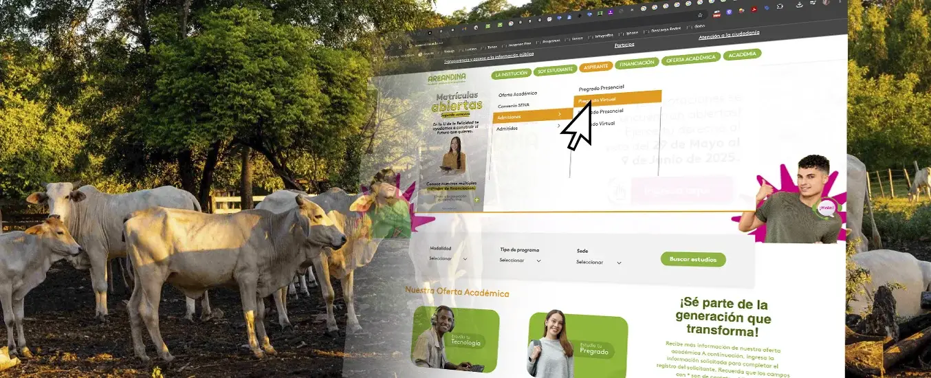 Para quienes deseen ser parte de este proceso educativo, el trámite de inscripción se realiza a través del portal oficial de la Fundación Universitaria Areandina. Al ingresar a la página, el primer paso es dirigirse al menú superior, seleccionar la pestaña ‘Aspirante’, hacer clic en ‘Admisiones’ y luego en ‘Pregrado virtual’.