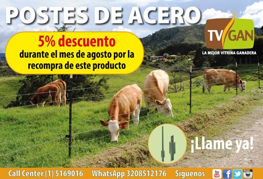 La vitrina ganadera más importante de Colombia ofrece en el mes de agosto una oferta única para adquirir postes de acero de excelente calidad a un increíble descuento. Aproveche antes de que se agoten las existencias. Si está pensando en renovar la cerca de su finca, piense en utilizar postes de acero, que constituyen una alternativa de fácil instalación, durable y amigable con el medio ambiente. (Lea: 2 excelentes promociones de TVGAN en julio) Con estos postes, no es necesario cavar huecos profundos para introducir estacas de otros materiales, sino que solamente se requiere la fuerza para clavarlo directamente en el suelo, en un procedimiento que demora menos de un minuto. Además, están hechos de un material mucho más resistente y durable, por lo que no tendrá que preocuparse por reemplazar su cerca en mucho tiempo, y podrá dedicarse a otras tareas más demandantes de la actividad pecuaria. Gracias a su facilidad de transporte y manipulación, no se necesitan tantos trabajadores para renovar la cerca, así que usted también podrá ahorrar tiempo. (Lea: Equipos que usted debería tener en su predio ganadero) Si ya ha comprado postes de acero de cualquiera de las referencias de TVGAN, sabrá que obtendrá un producto de la mejor calidad y la garantía que ofrece la firma. Solo por este mes, usted podrá recibir un descuento especial de 5 % si vuelve a adquirir un combo de 100 unidades. No olvide que además de ser la vitrina más importante para comercializar ganados, TVGAN tiene un variado portafolio para adquirir, entre otros, combos de medicamentos para ganadería de leche y carne, cercas eléctricas, así como maquinaria para sembrar y ensilar pasto. Para conocer más sobre este y otros productos, puede ponerse en contacto con los asesores en los teléfonos en Bogotá (1) 5169016 o al Whatsapp interactivo 320 8512176. (Lea: Promocione sus animales en TVGAN con un video grabado por usted mismo) También ingrese a la página www.tvgan.com.co, escriba al correo electrónico [email protected] o consulte los perfiles de Facebook, Twitter, YouTube e Instagram.