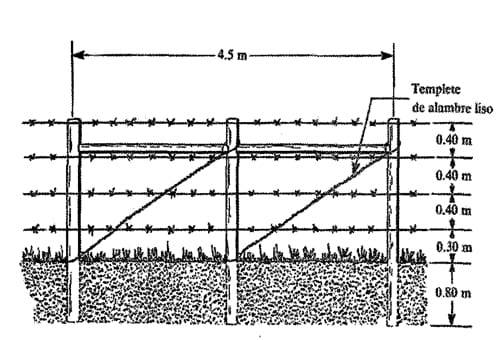 Para mantener la tensión de los hilos del alambre, se utilizan estaciones templadoras cada 105 m (esto es, cada 6 postes) y para conservar la distancia entre los hilos se trenzan entre ellos torniquetes de alambre liso No. 8 cada 3 m.