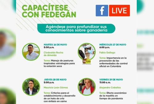Recuerde que la Federación Colombiana de Ganaderos (Fedegán), administradora del Fondo Nacional del Ganado (FNG), está ofreciendo capacitaciones durante la cuarentena. Esta semana tratarán temas sobre mastitis, cría con énfasis en carne y enfermedades de control oficial.