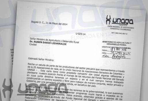 La Unión Nacional de Asociaciones Ganaderas Colombianas, Unaga, le hizo llegar una carta firmada por su presidente Ricardo Sánchez al ministro de Agricultura Rubén Darío Lizarralde, para darle a conocer las razones por las que considera inoportuna una eventual división en la administración de los fondos parafiscales del sector.