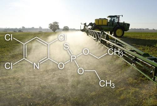 El clorpirifos es un plaguicida organofosforado de color blanco de apariencia cristalina y de aroma fuerte; es el ingrediente activo de varios insecticidas comerciales, como por ejemplo los productos Dursban® y Lorsban®, lo cuales son utilizados en cultivos, animales y edificios, para la eliminación de plagas, principalmente insectos y gusanos. Este insecticida actúa sobre el sistema nervioso de los insectos al inhibir la enzima acetilcolinesterasa, es decir, evita que las neuronas se puedan comunicar entre ellas correctamente.